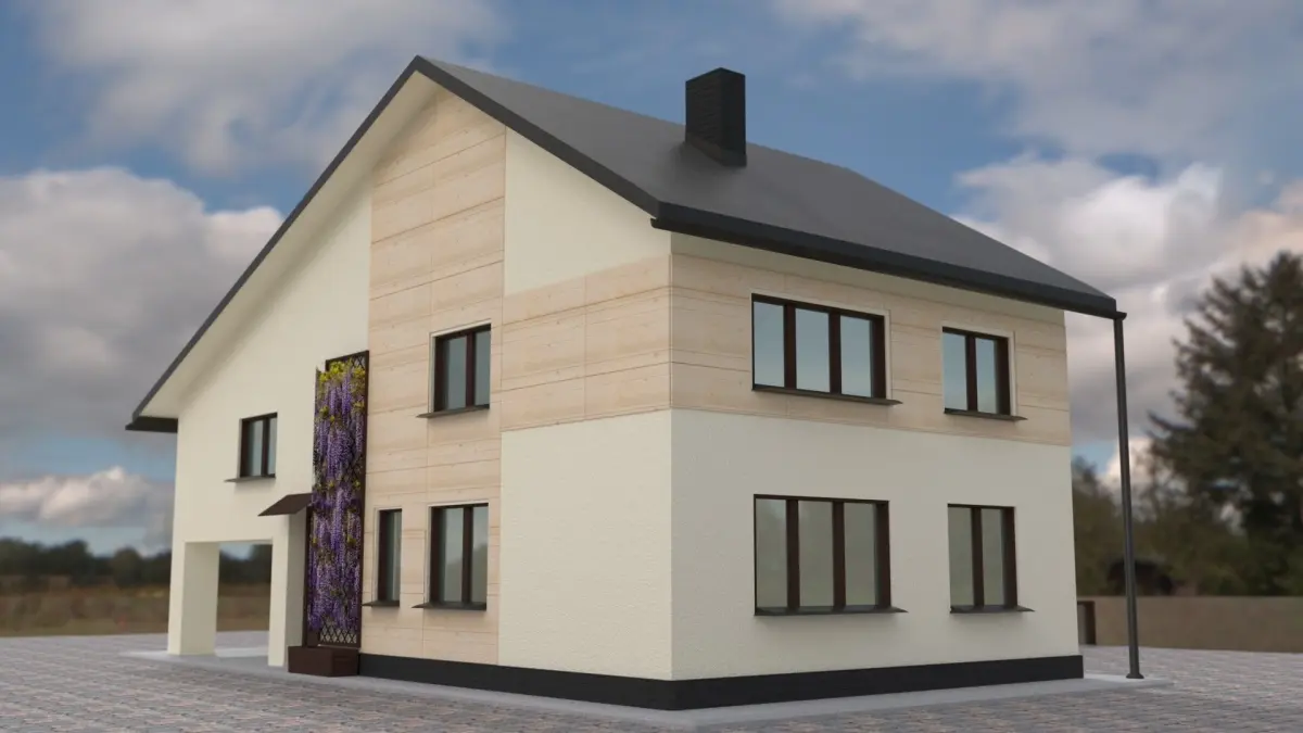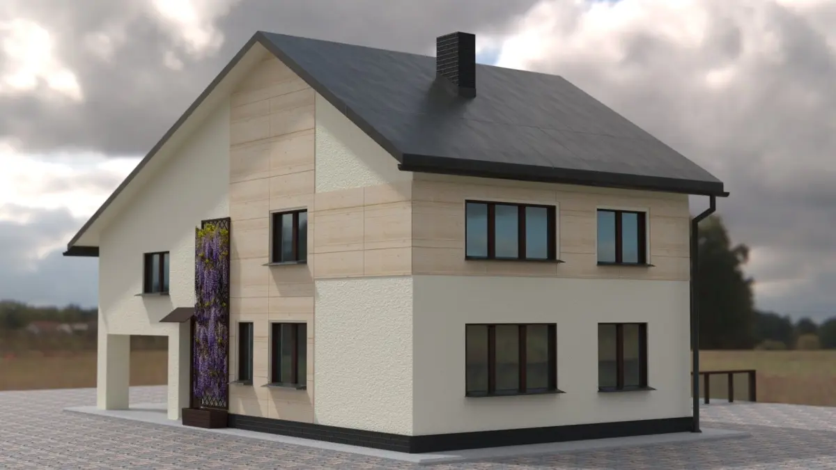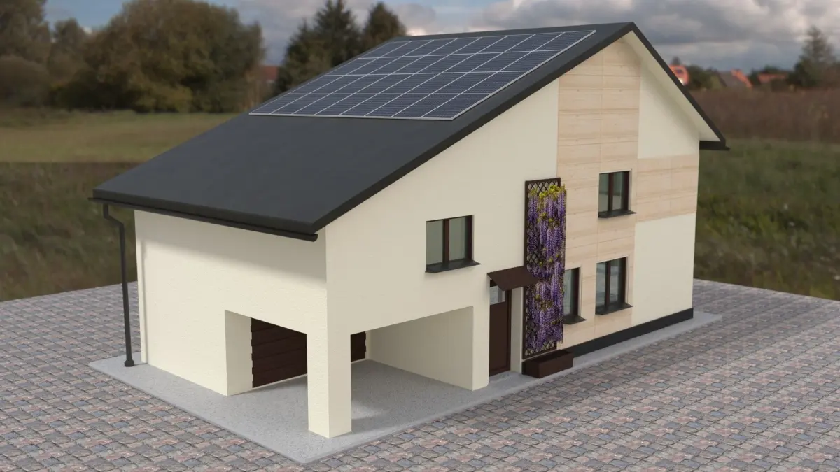 Simple house design. Sloping roof made of sheet metal, two floors, photovoltaic panels, garage, terrace. Note, the file does not contain a background or flowers.