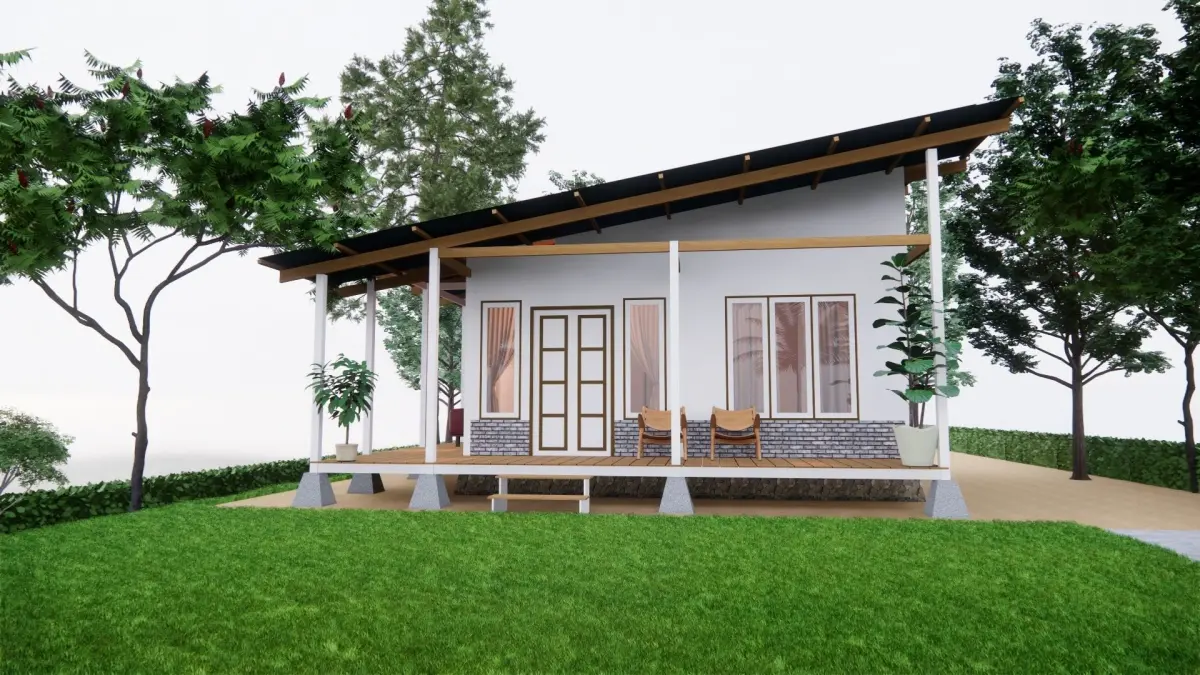 stilt house by design sketchup, a fully textured and illuminated outdoor scene with two different lighting settings (day and night) ready to render with v-ray and enscape or higher in 3D Max or higher.