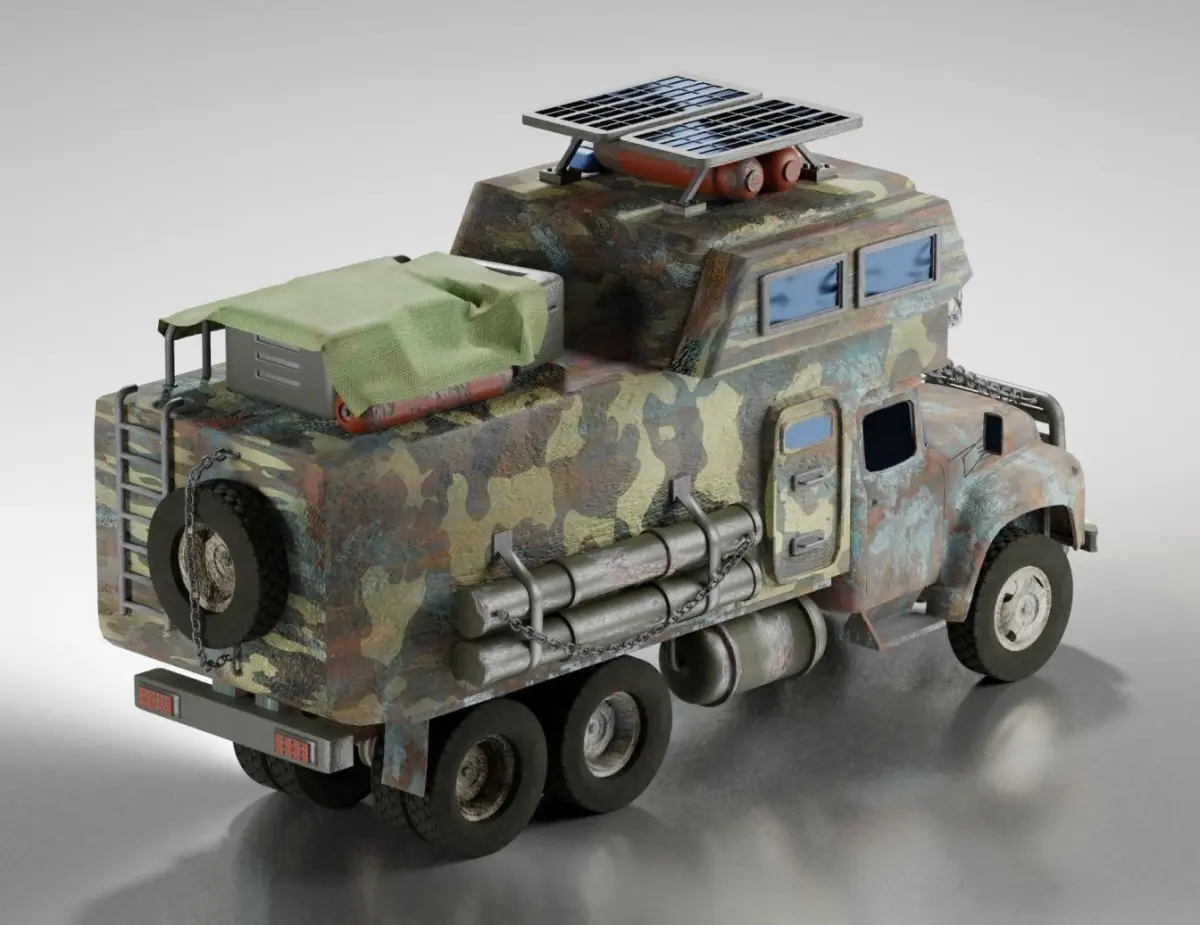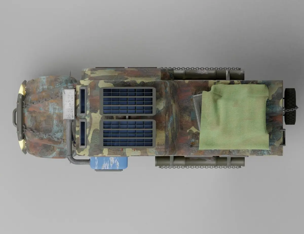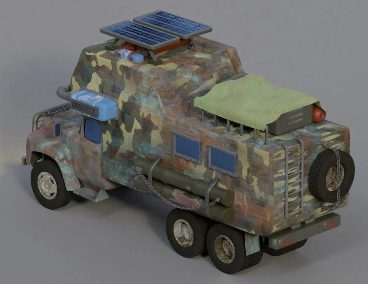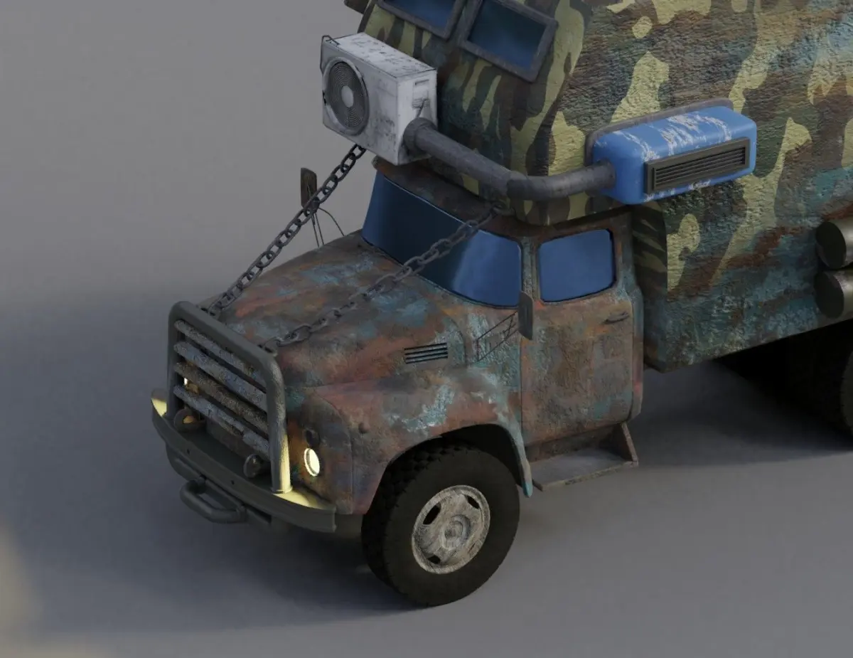 Soviet-russian house on wheels with survival attributes. Partly procediral materials and partly textures - gives a lot of control in color gamma. Multiple maps for main parts PBR rendering included. Exterior and parts fully custom - all divided and with option to remove them. Rendered using cycles in blender.