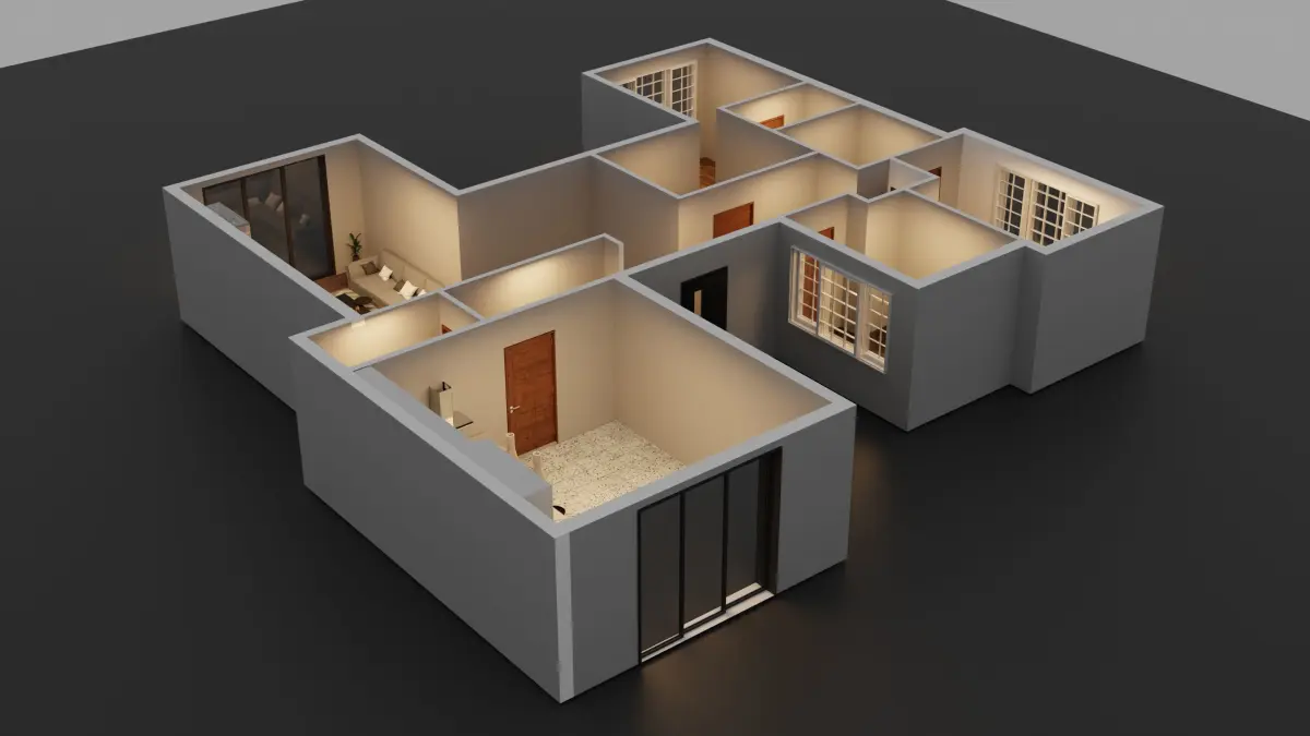 House plan example with some assets. Isometric projection.Made in Blender 4.1. Rendered by Cycles.Also available formats to download: fbx, obj, stl and dae (collada).Procedural materals and textures.Hope you like it!