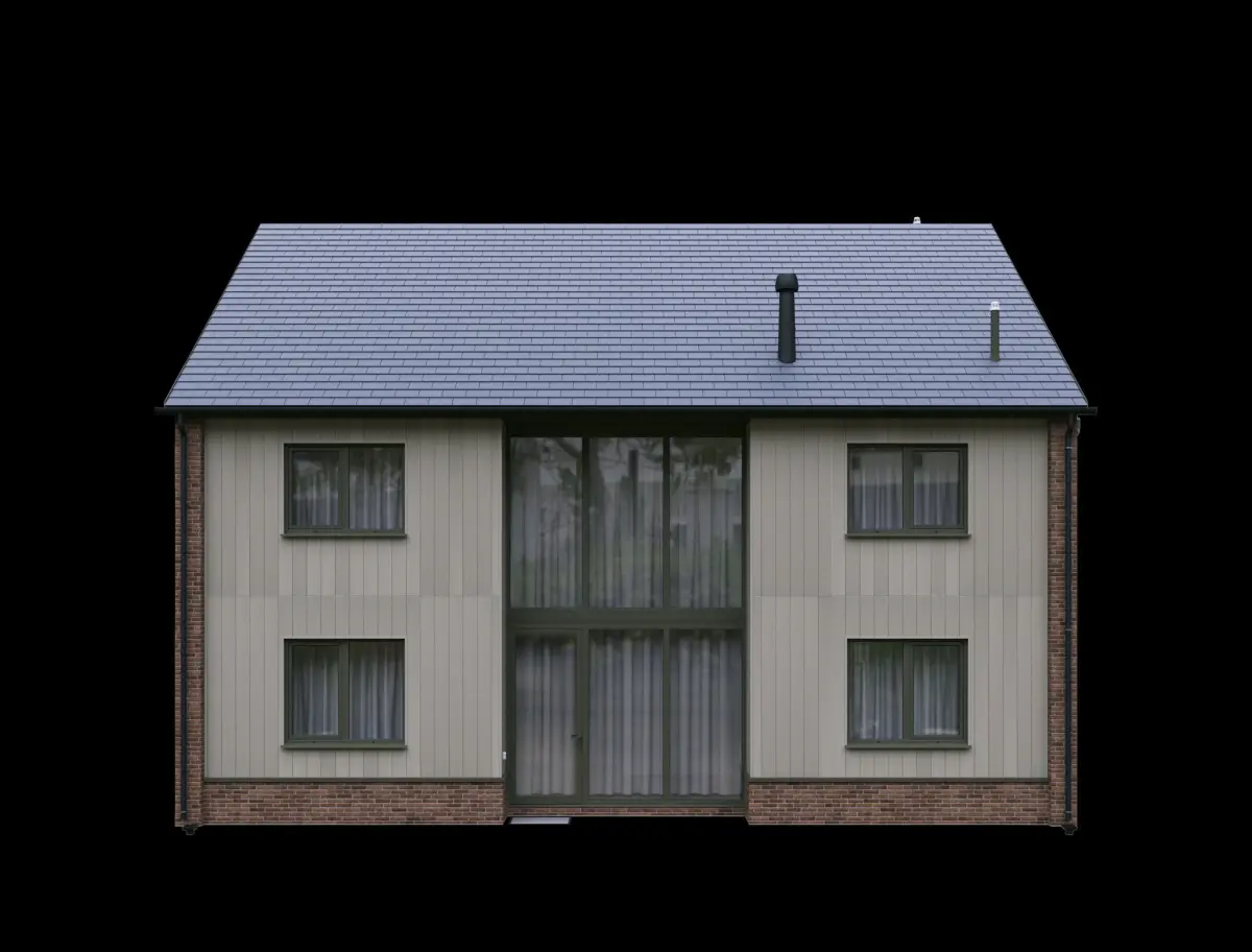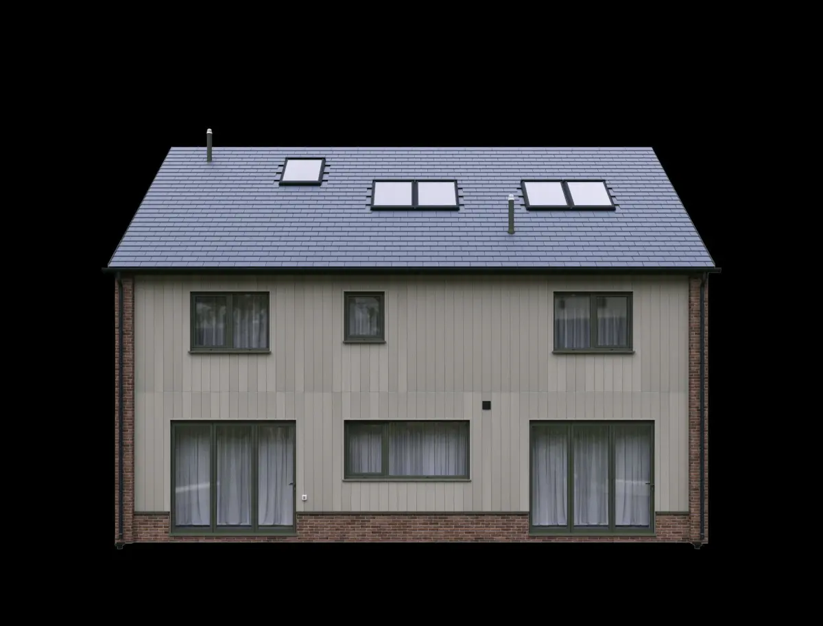 Two storey private house, made of bricks and fiber cement boards, UK style.