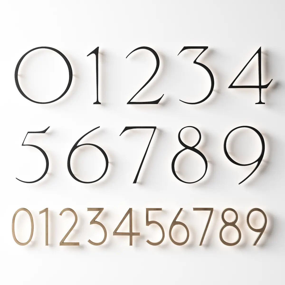 The 3D model contains metal numbers for a house number or other use. 2 design options. 2 color options - black and brass. Procedural materials. Backlight on the back of the digit.