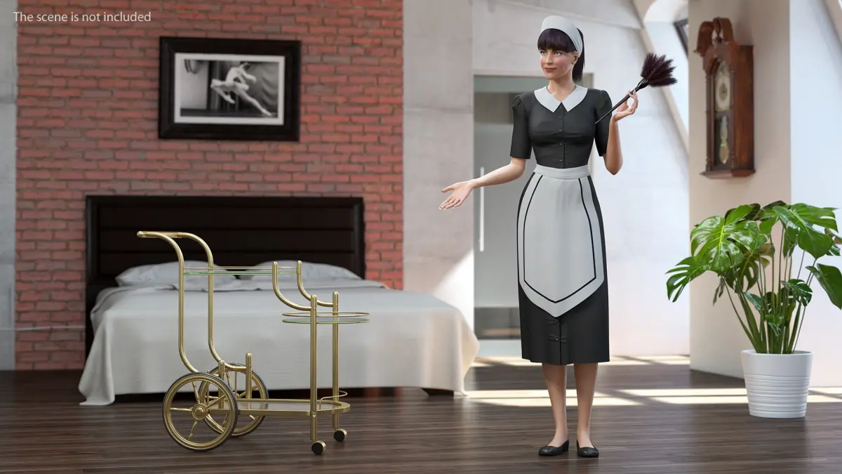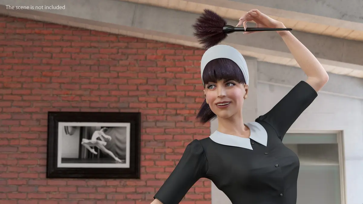 Housemaid Character with Duster Rigged for Maya is a three-dimensional model of housekeeping maid, who is a female home worker with special black feather duster.