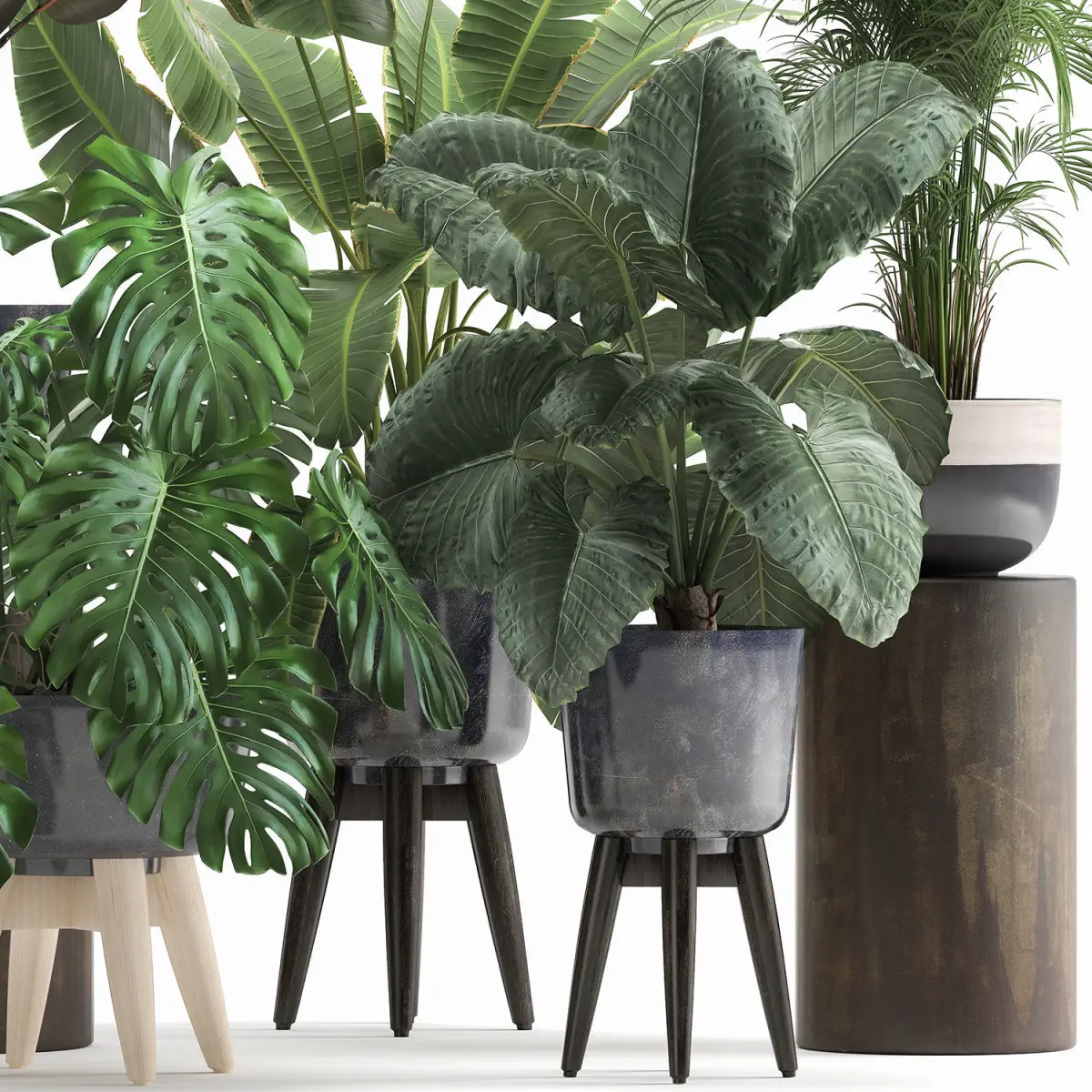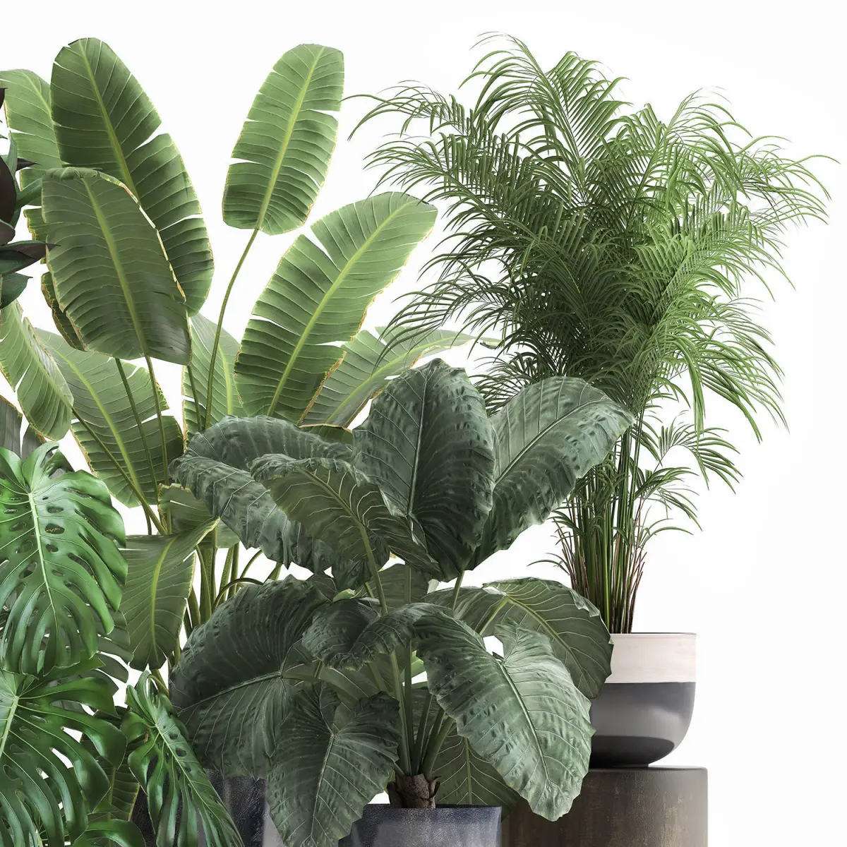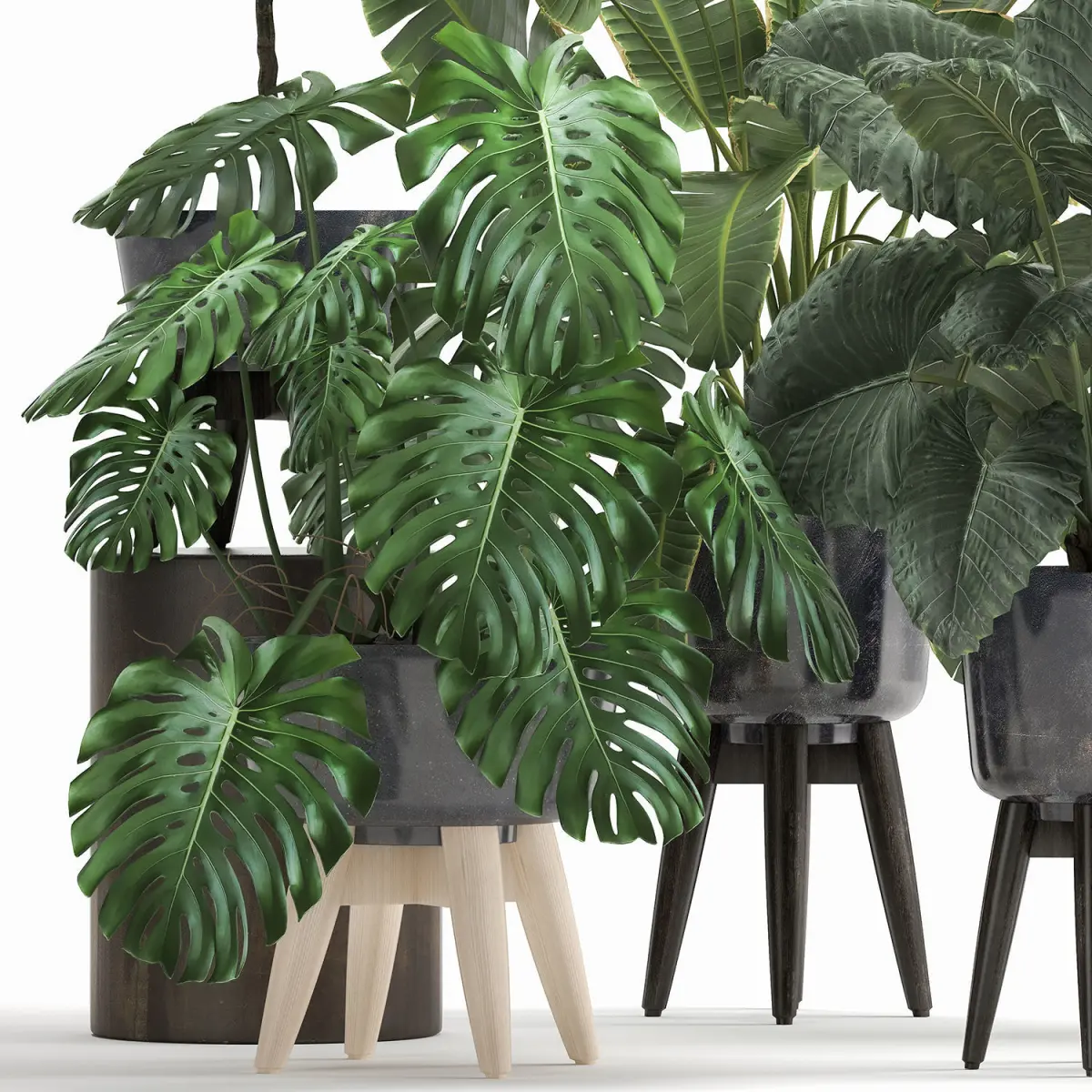 Ornamental plants for outdoor and interior in black pots.Houseplantsexotic plantsTropical plantsMonstera alocasia macrorrhizaAlocasiaOrnamental palm tree HoveaFicus elasticabanana palmRavenalaStrelitzia