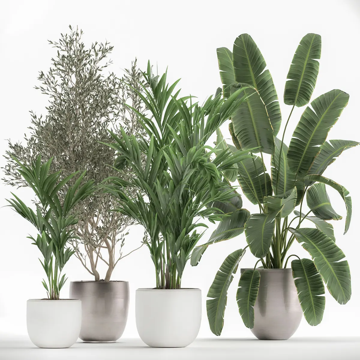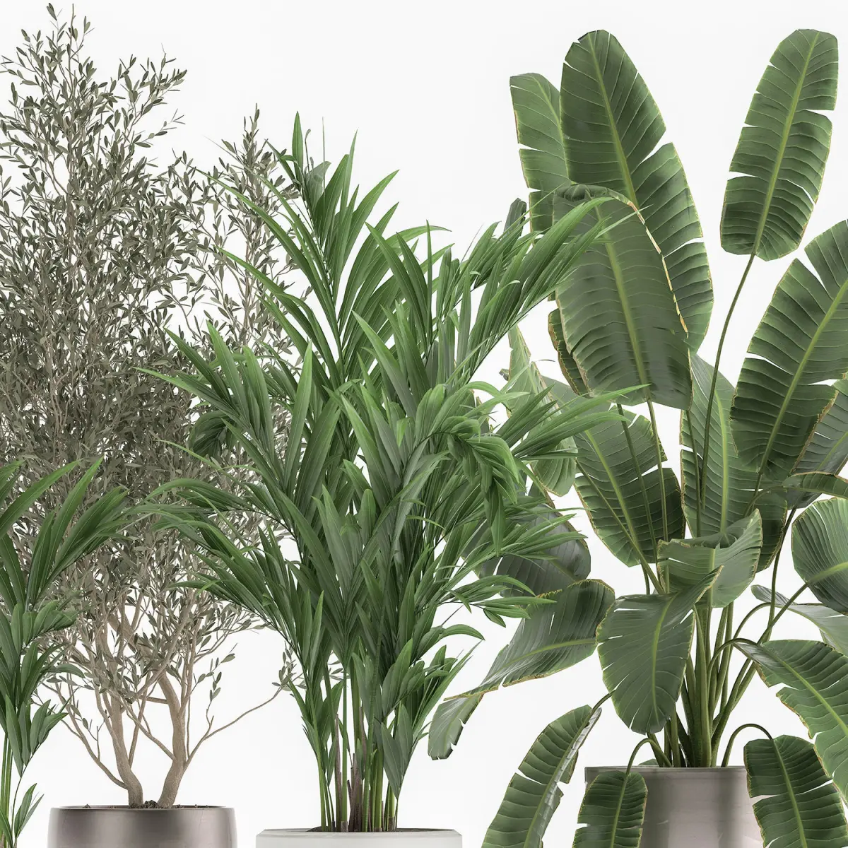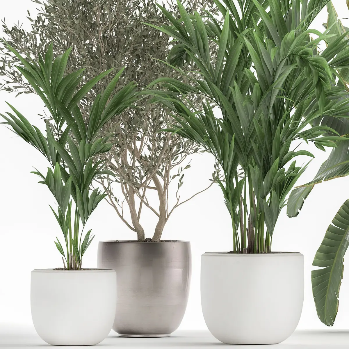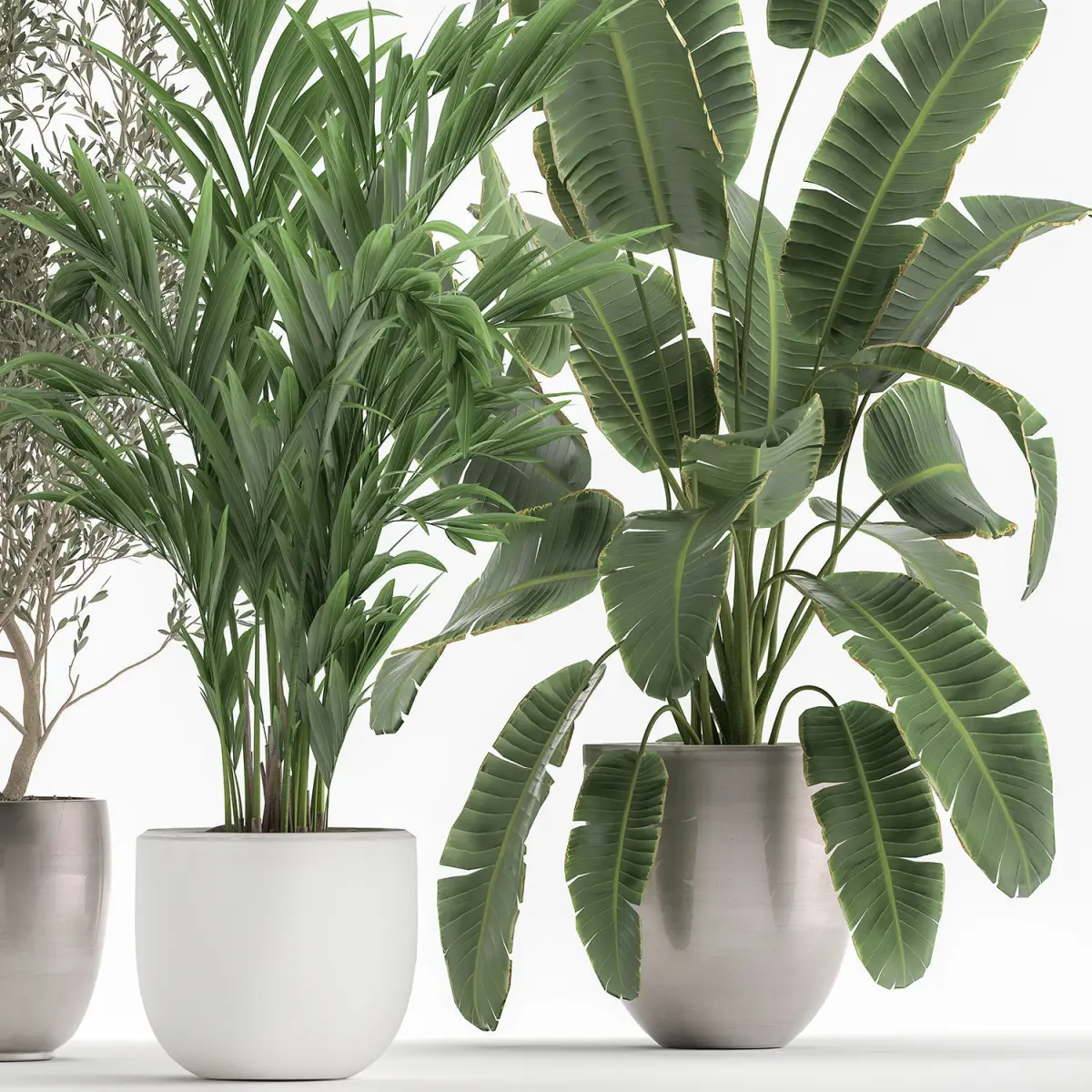Ornamental plants for the street and interior in flowerpots. White flowerpotHouseplantsexotic plantsTropical plantsDecorative trees in flowerpotsOlea - Olivebanana palmRavenala madagascariensisStrelitziaHovea, KentiaOlive tree