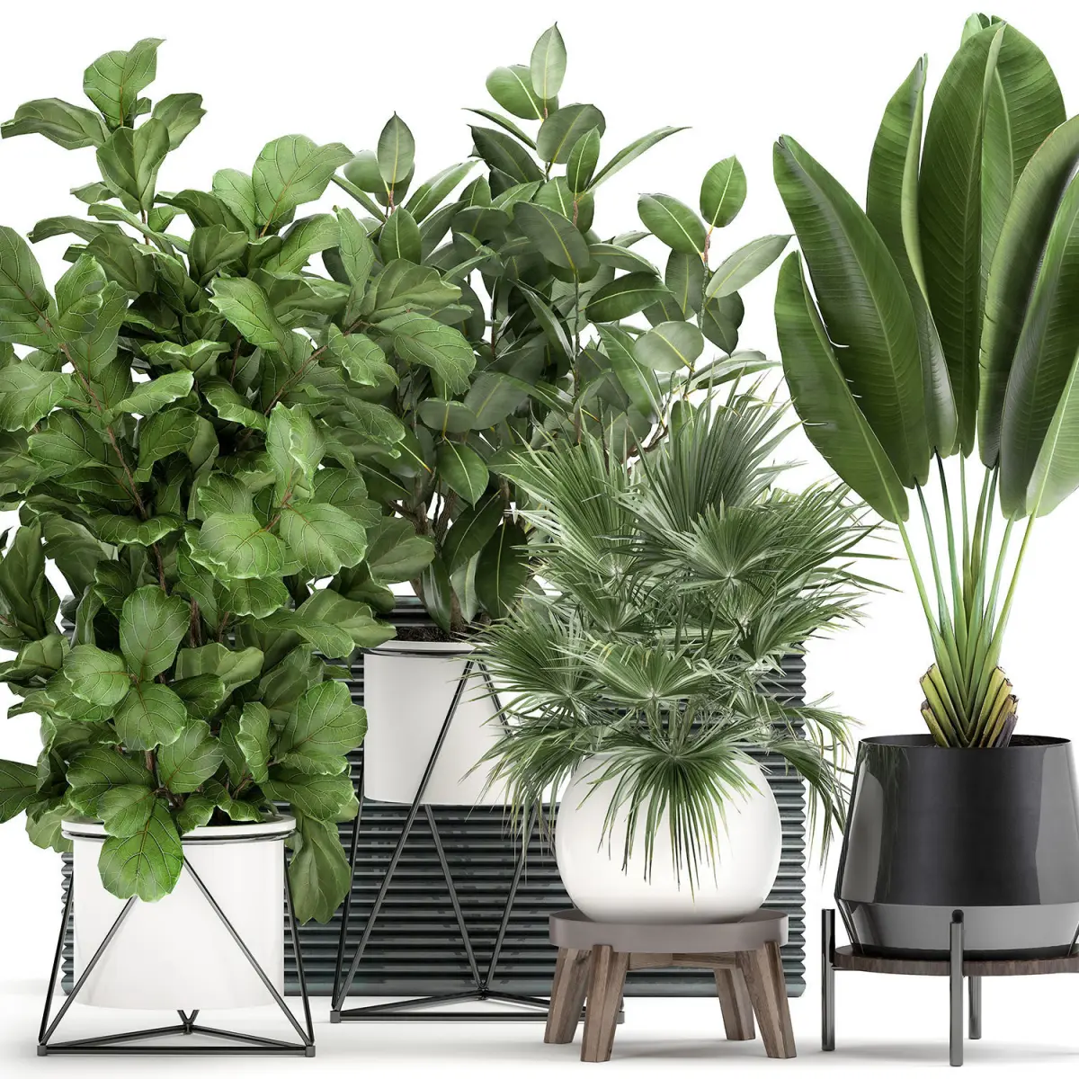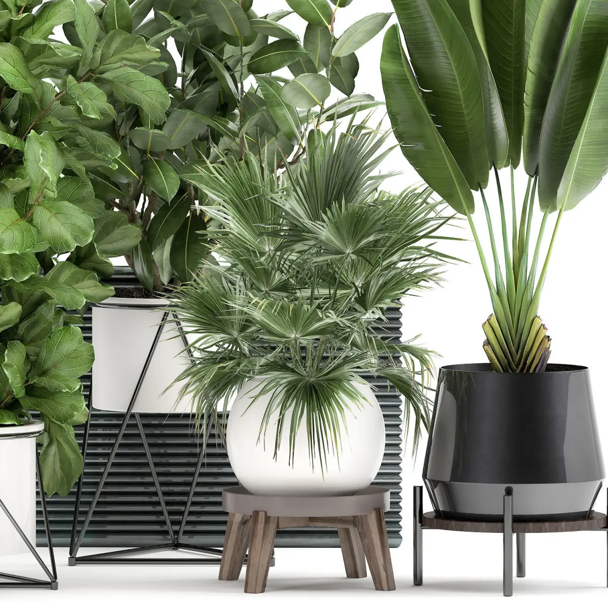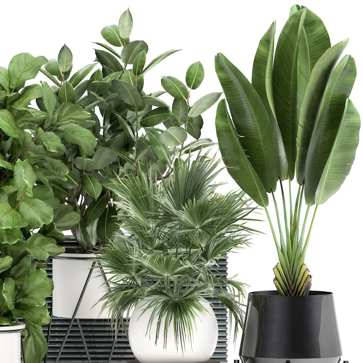 Ornamental plants for outdoor and interior in pots.Houseplantsexotic plantsTropical plantsDecorative palmbanana palmStrelitziaRavenala madagascariensisFicus lyrataFicus elasticaFicus rubberyLivistonaCoccothrinax fan palm