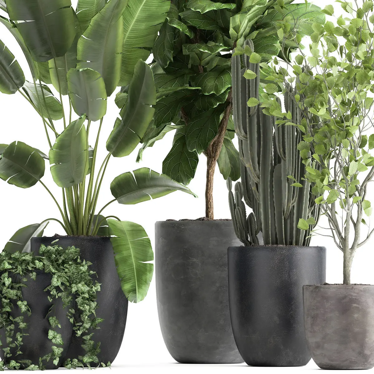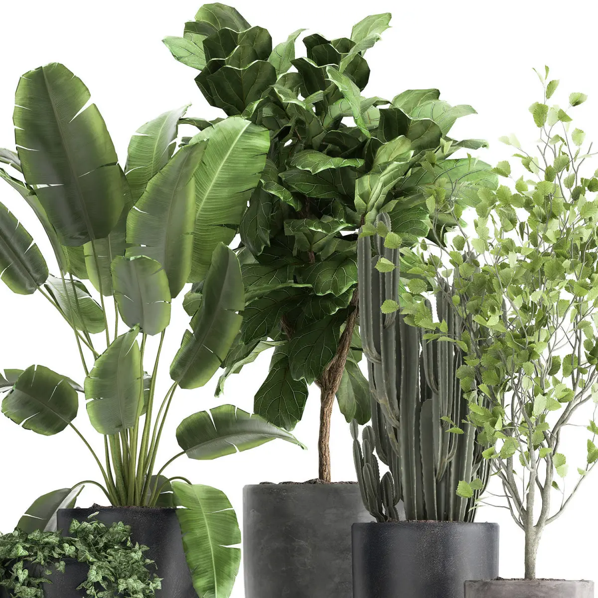 Ornamental plants for outdoor and interior in black pots.Houseplantsexotic plantsTropical plantsDecorative trees in flowerpotsDecorative palmbanana palmRavenala madagascariensisStrelitziaFicus lyrataCorylus, filbert, HazelTiliaCereuscactus