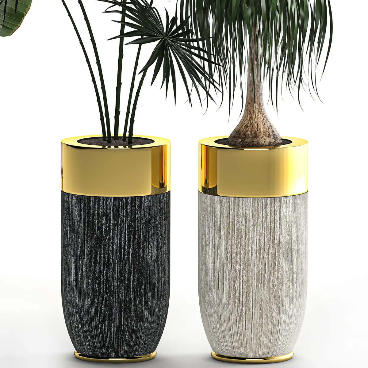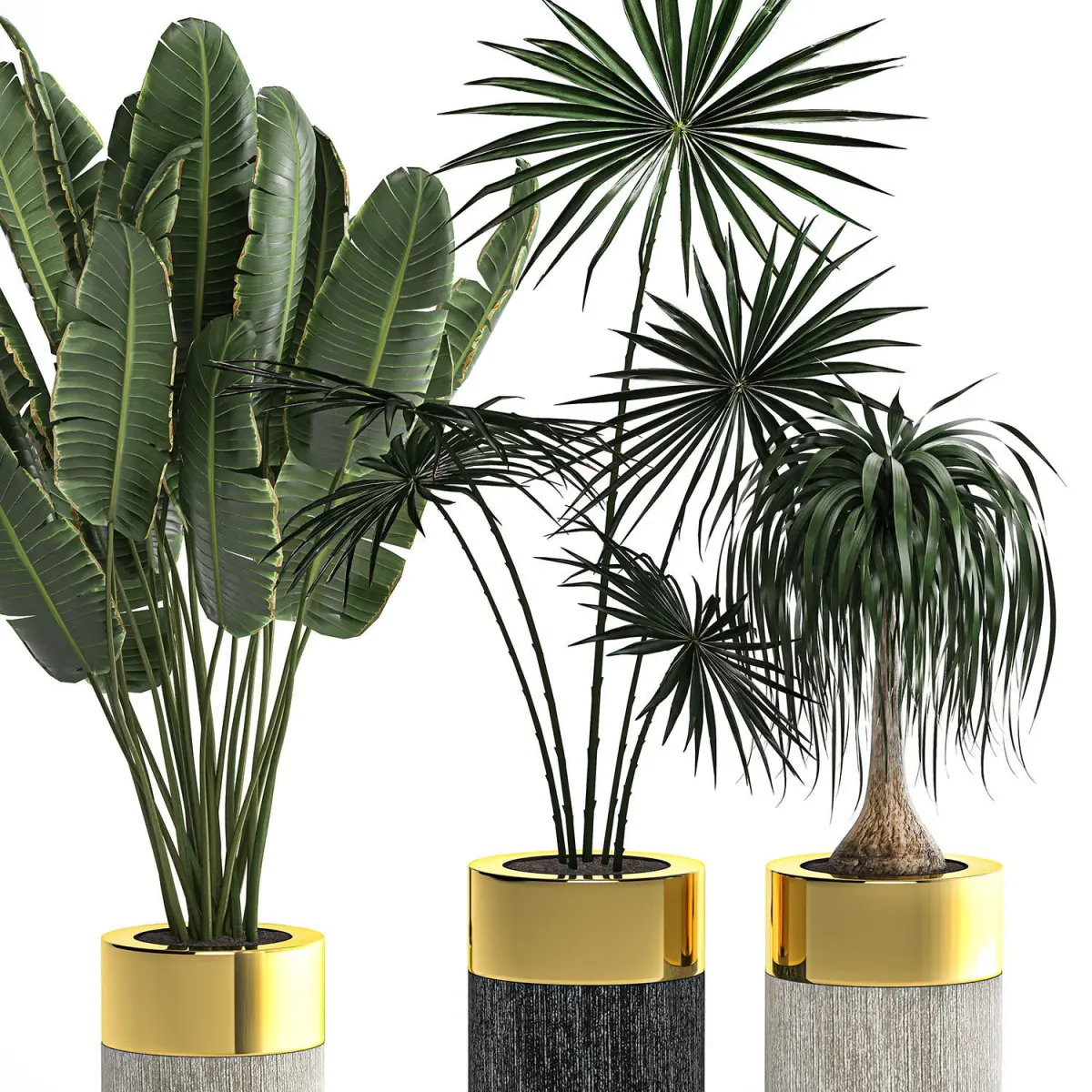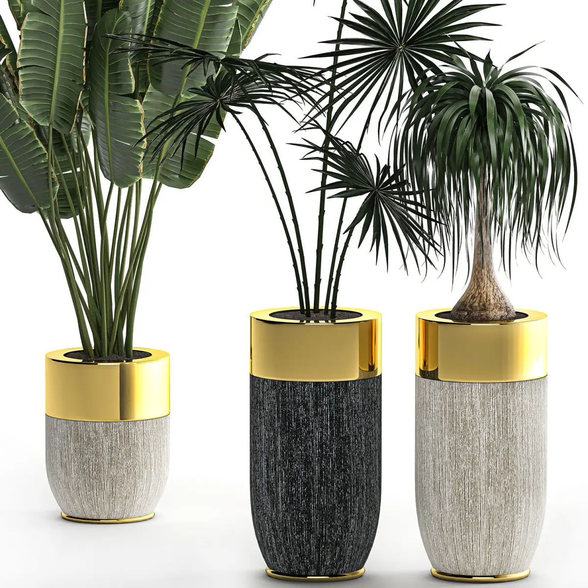 Ornamental plants for the street and interior in flowerpots.Houseplantsexotic plantsflowerpot Y712 Godwin Longhi, size 860 * 400, 560 * 400 mm. luxurybanana palmRavenala madagascariensisStrelitziaHamerops (fan palm)CoccothrinaxThrinaxBeaucarnea recurvataDracaena