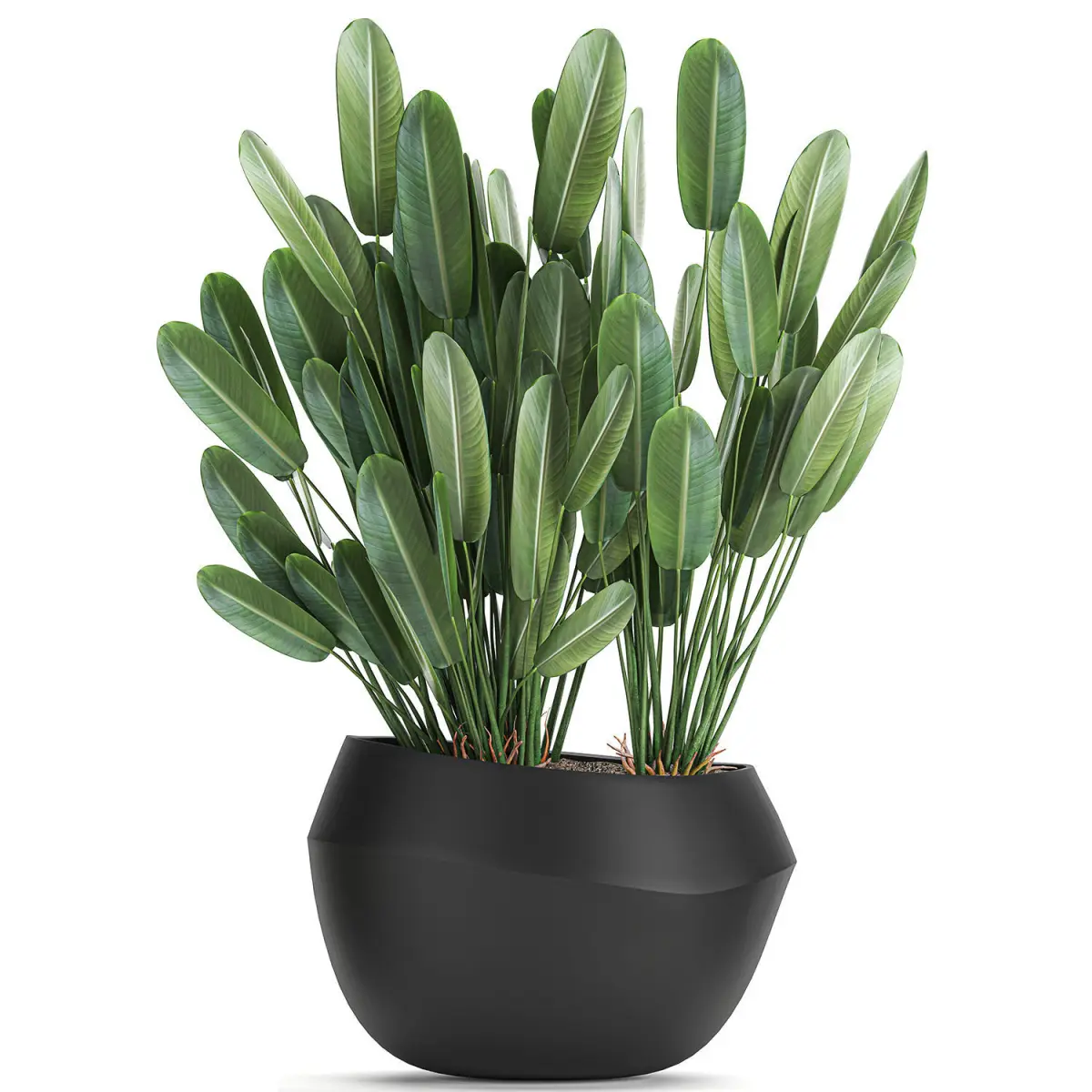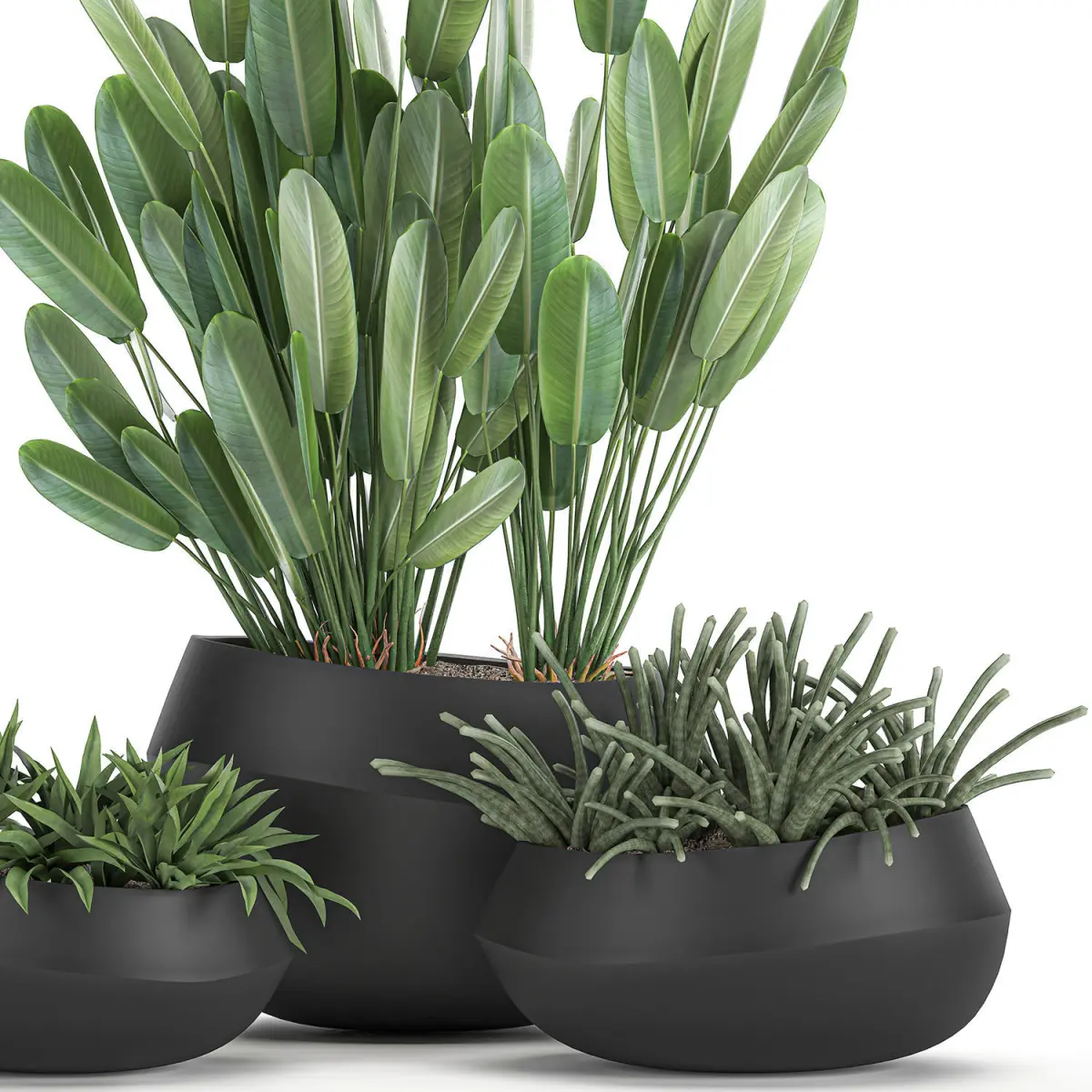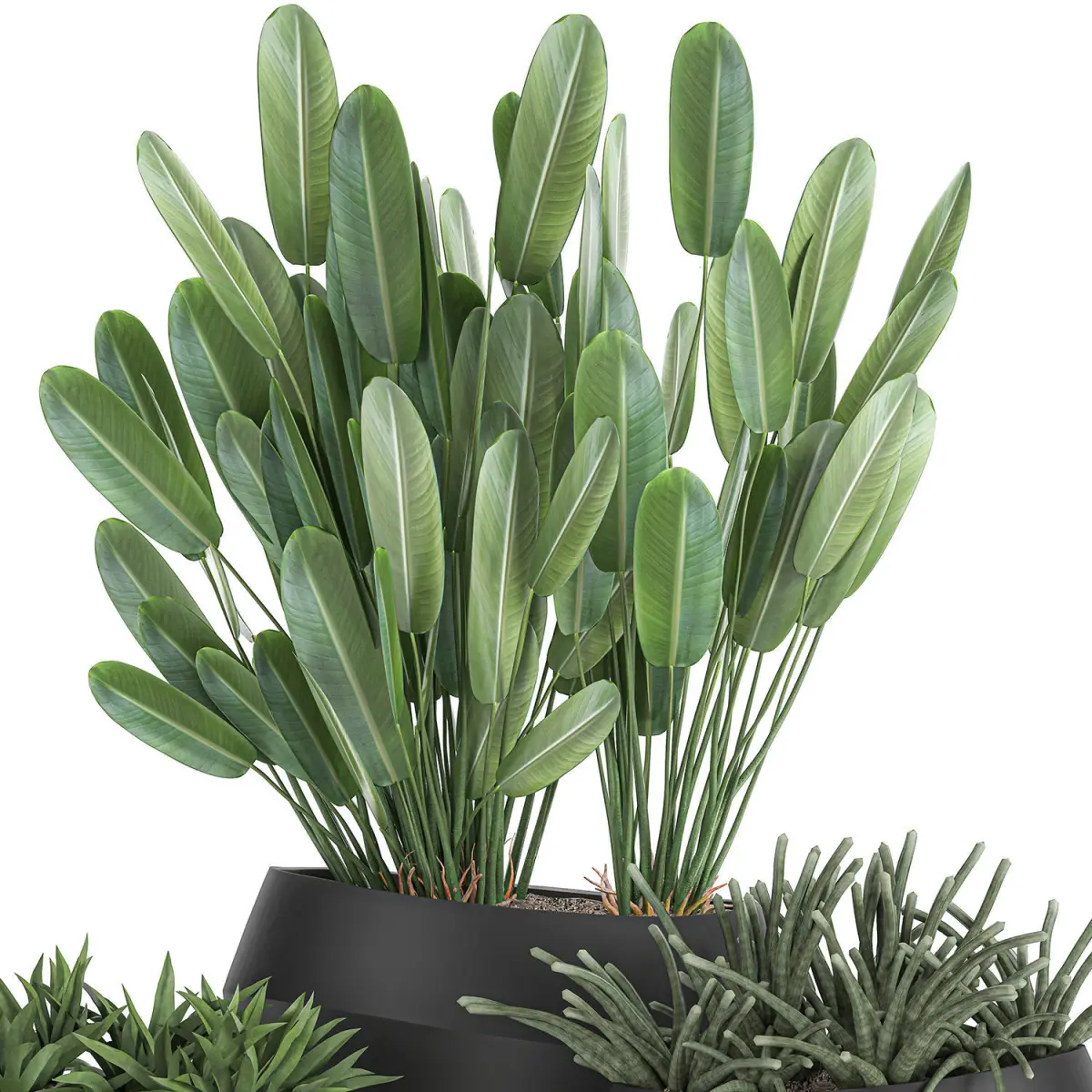 Ornamental plants for the street and interior in black flowerpots.Houseplantsexotic plantsTropical plantsbanana palmRavenala madagascariensisStrelitziaSansevieria cylindrica