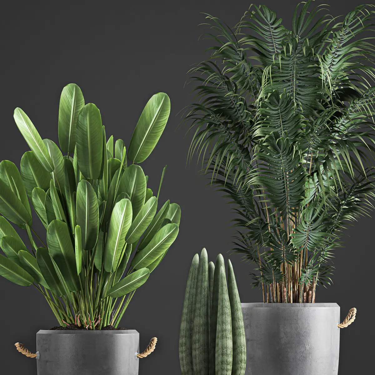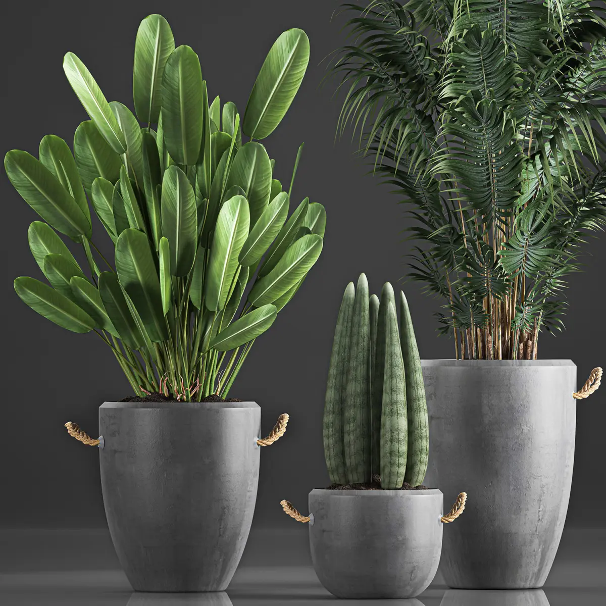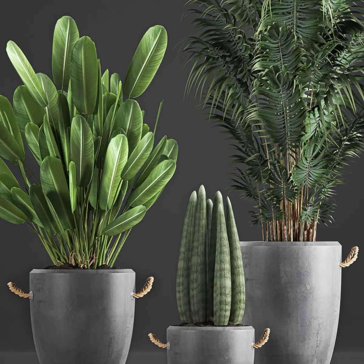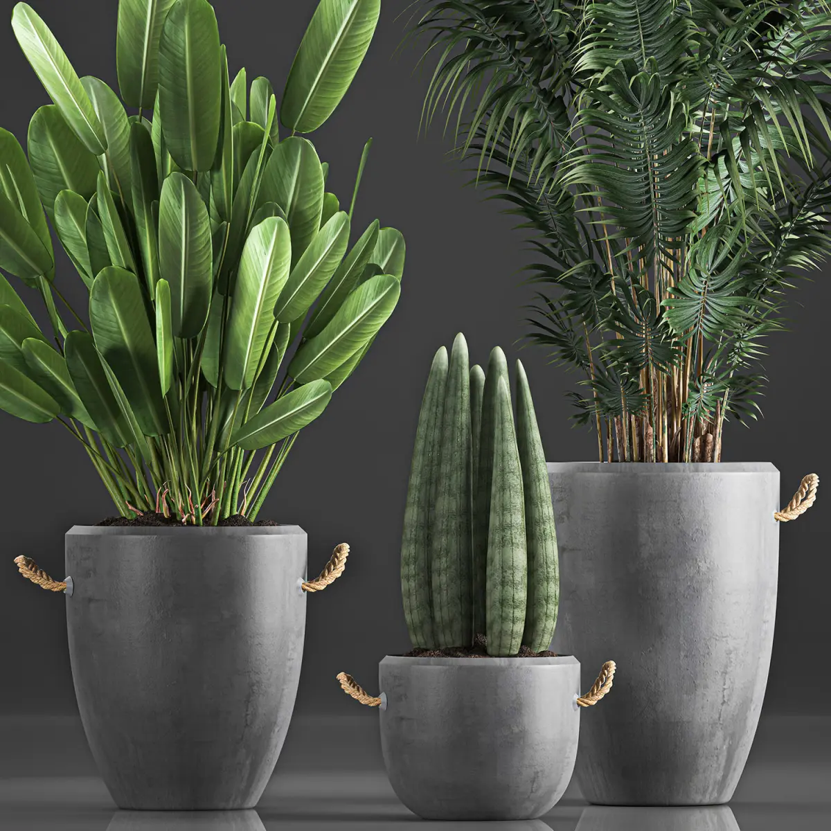 Ornamental plants for outdoor and indoor use in concrete vases.Houseplantsexotic plantsTropical plantsbanana palmRavenala madagascariensisStrelitziaSansevieria cylindricaHowea forsterianaDecorative palmConcrete pot