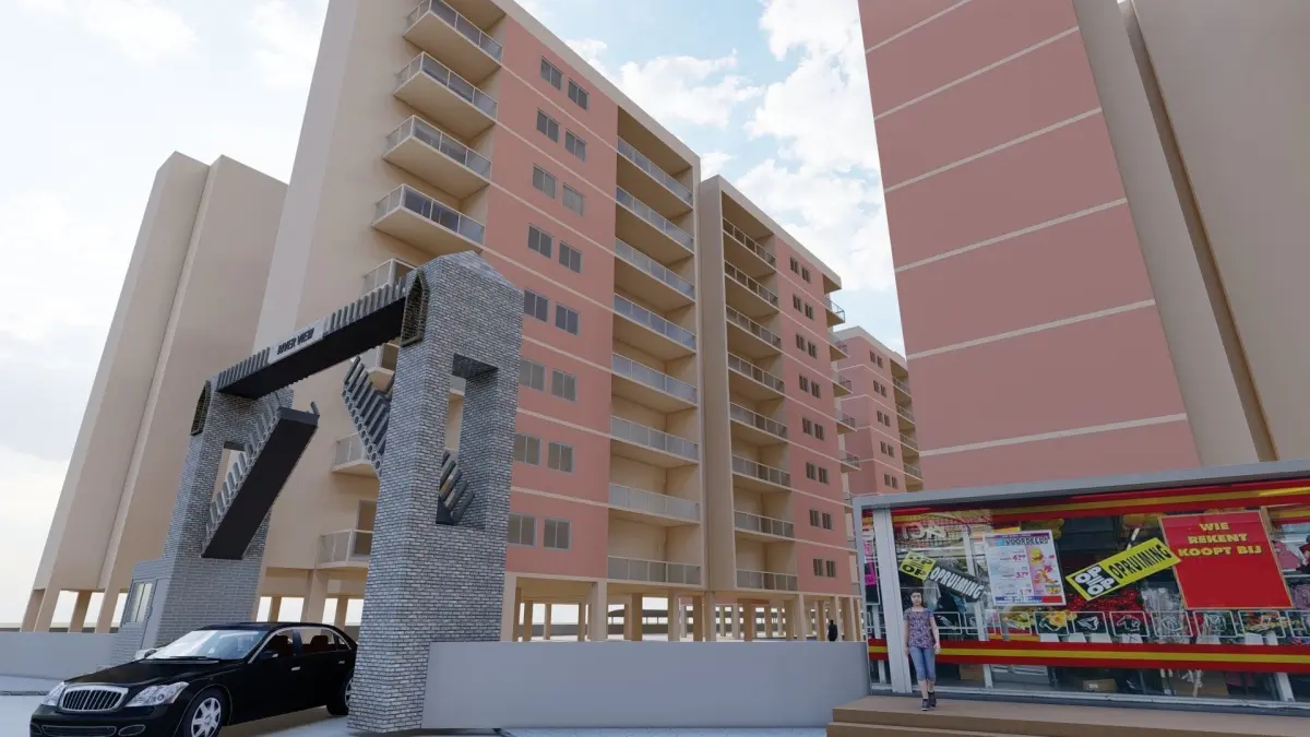 This is an architectural design project of a housing complex containing 2 buildings of 3bhk flats, 4 buildings of 2bhk flats, 3 buildings of 1 bhk flats, clubhouse, entrance gate, garden, etc.