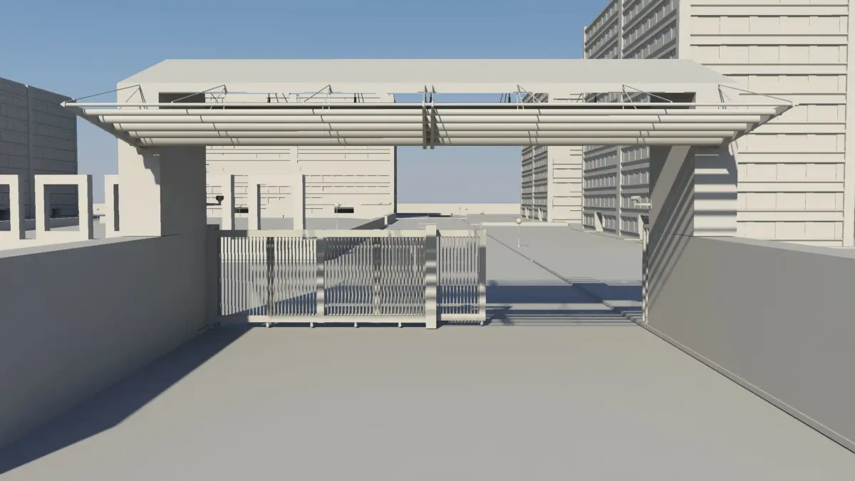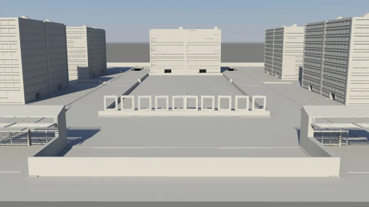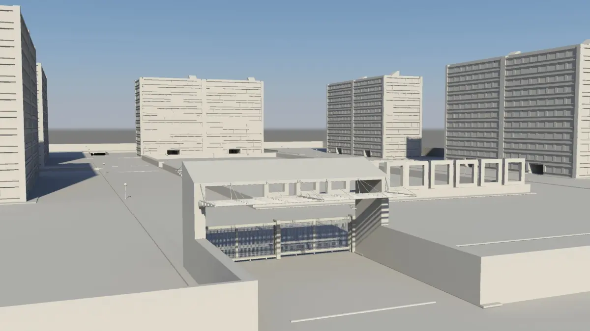 A 3D model of a housing society. What we usually dream of staying in is a garden in between four buildings, orange lights in the evenings, a safe place.