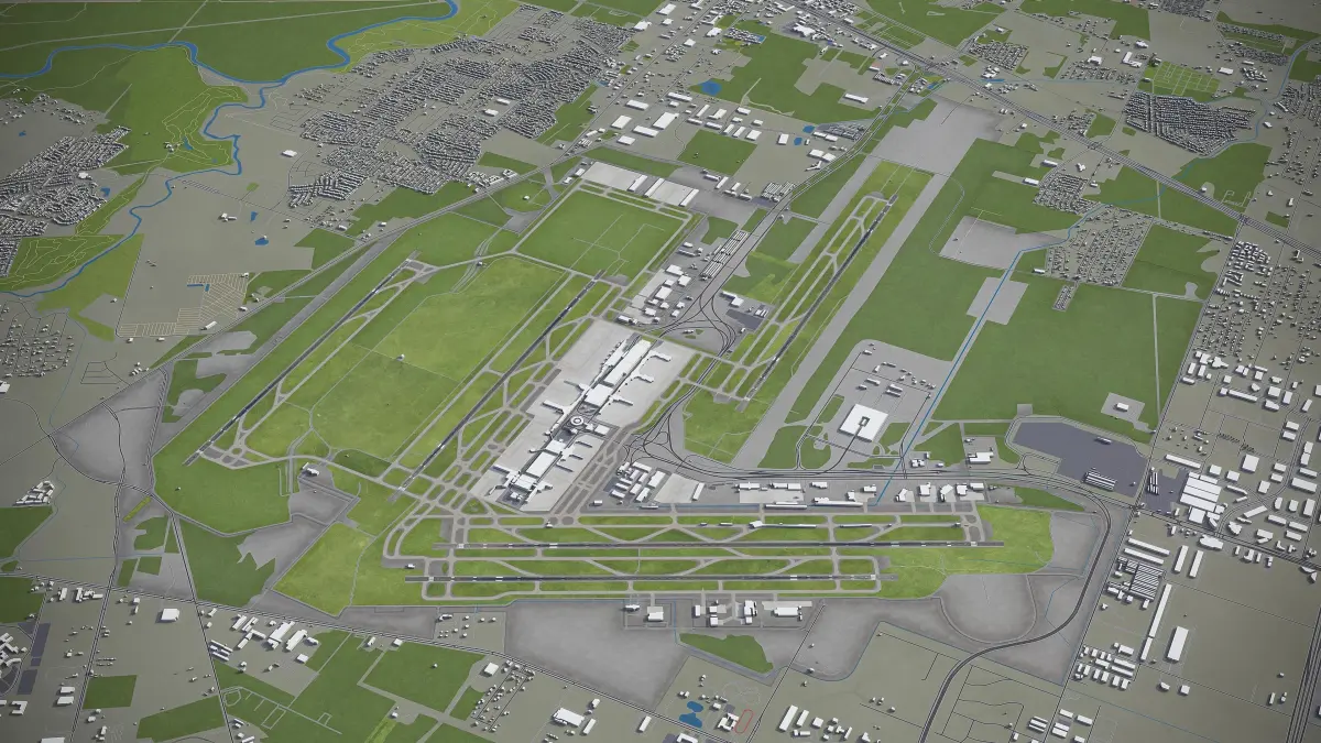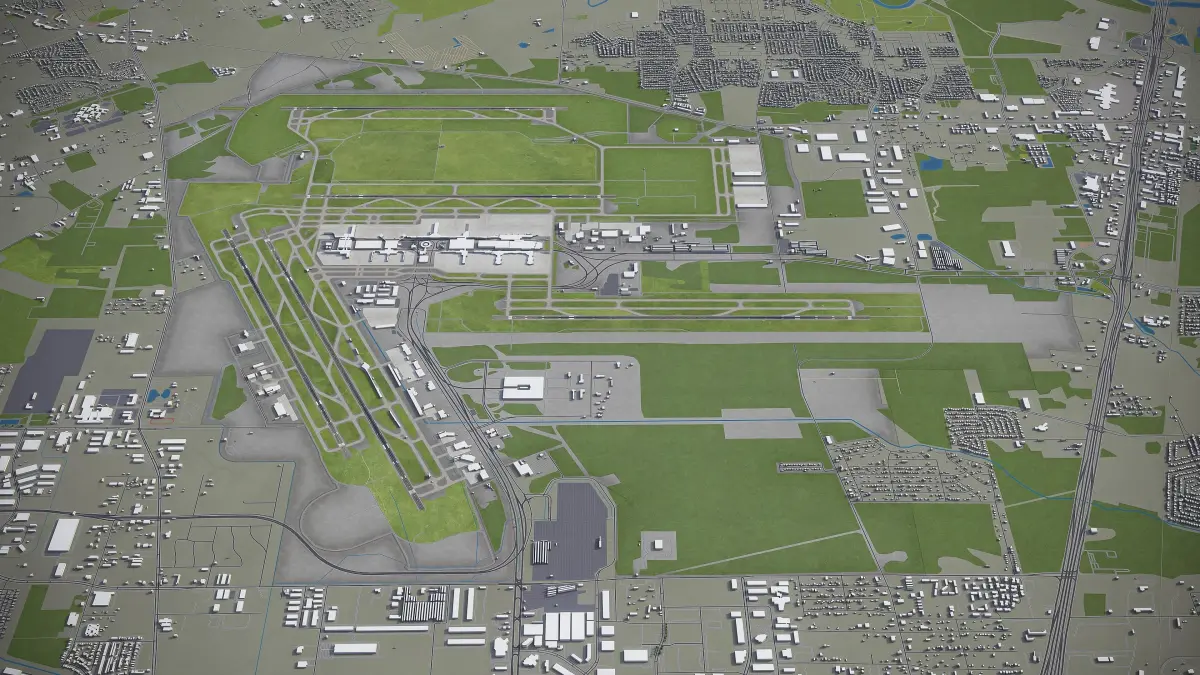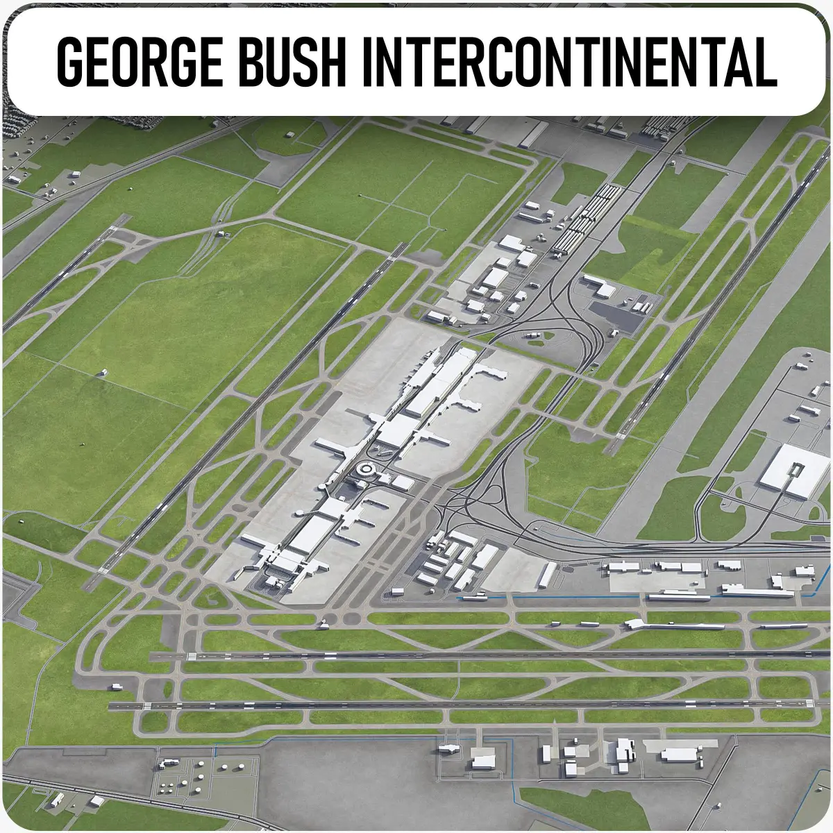 This is exact and accurate to-scale 3D model of George Bush Intercontinental Airport (IAH) and its surrounding area based on GIS data (April 2020)