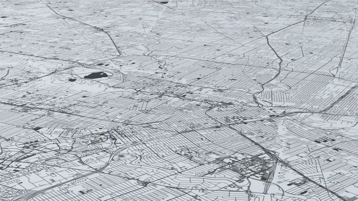 - the model is positioned on a flat surface (road network is on the “floor” - no elevation data included)