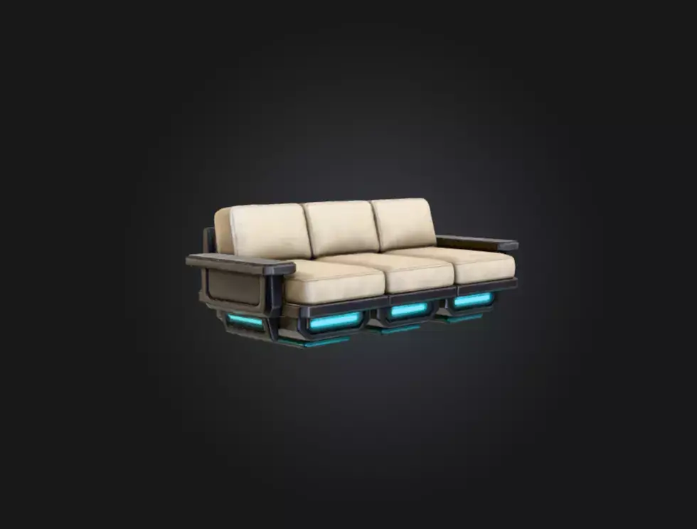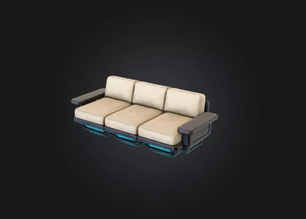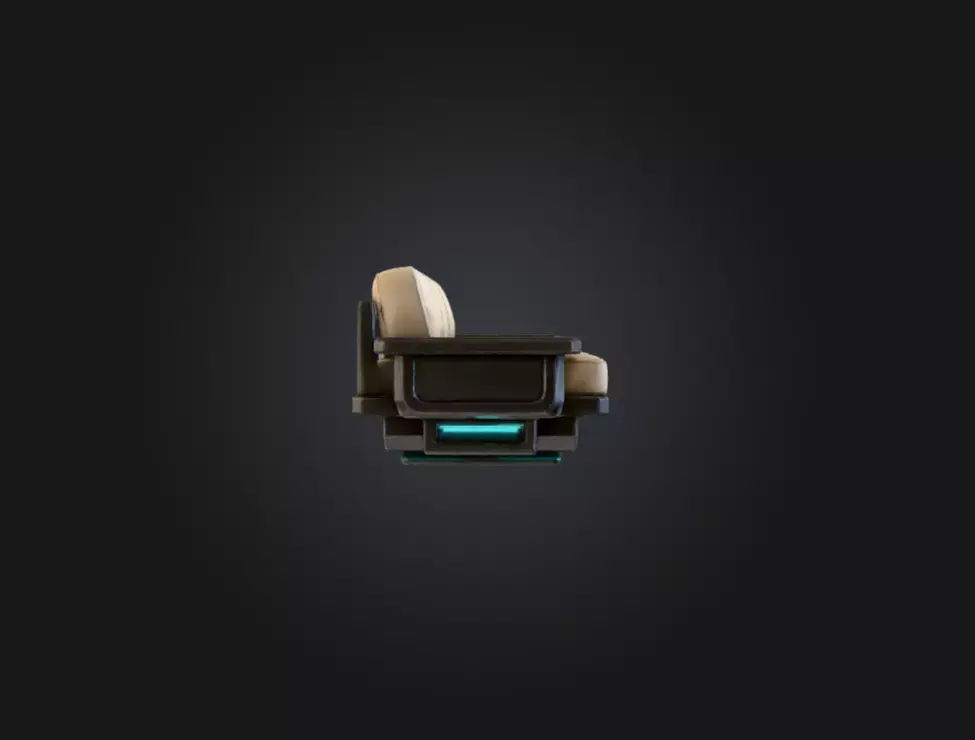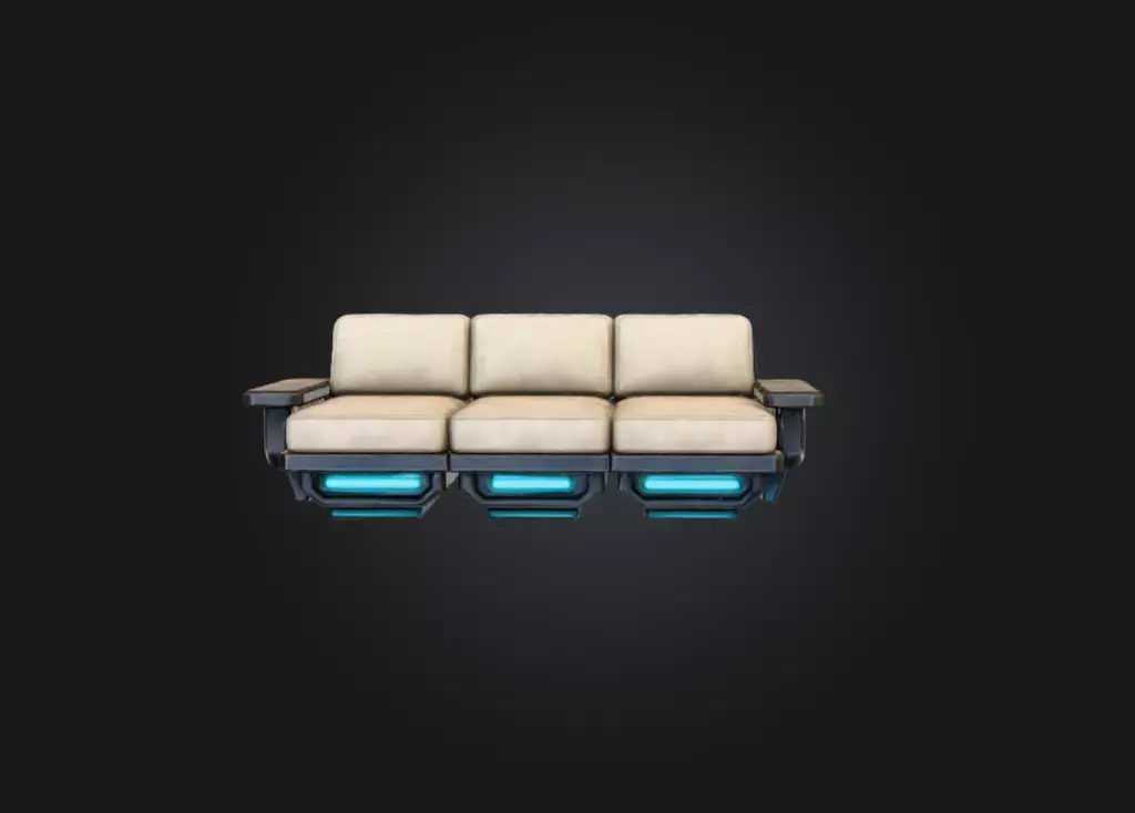 What sets this sofa apart is its advanced hovering base system. The support platform beneath each seat features engineered modules illuminated by vibrant cyan energy bars, creating the illusion that the sofa is floating effortlessly above the ground. These glowing elements enhance the sci-fi atmosphere, making the piece ideal for futuristic environments, digital homes, starship interiors, ultra-modern lounges, or cyberpunk scenes. The hovering effect adds a striking sense of weightlessness and motion, elevating the asset far beyond ordinary furniture.