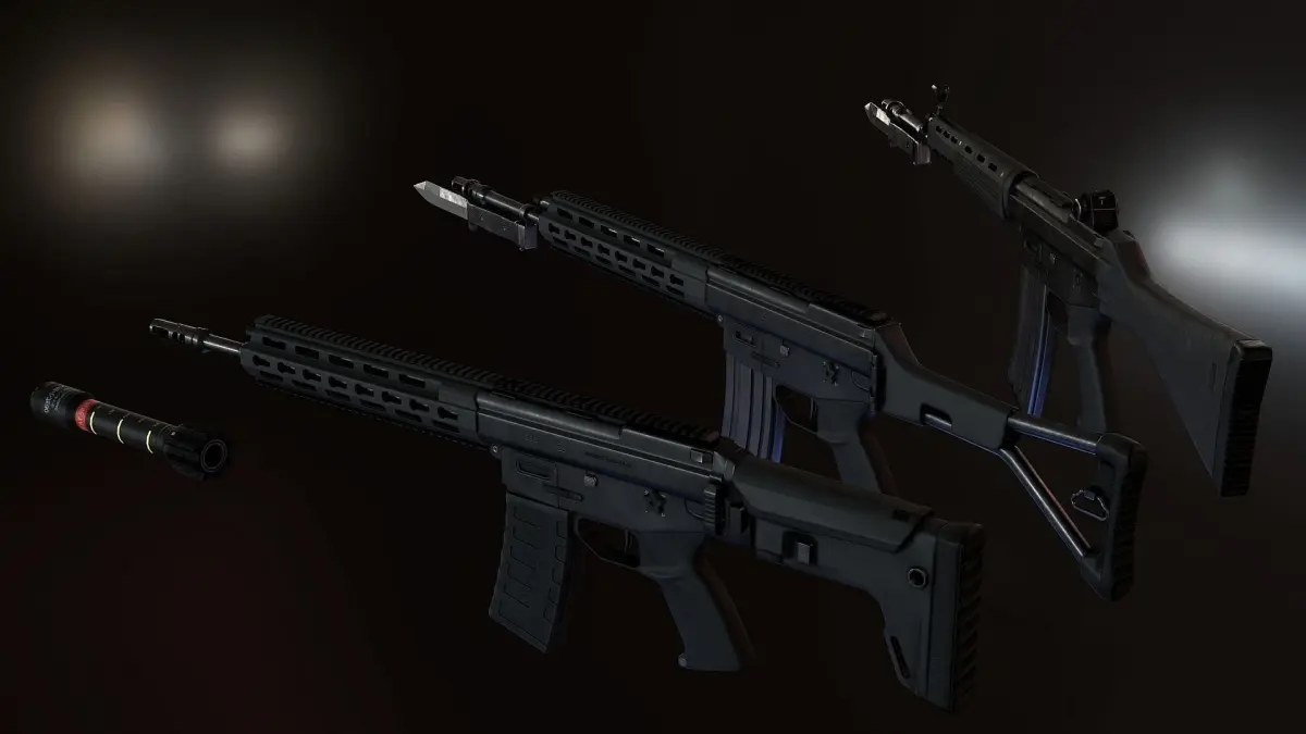 Pack contain three versions of rifle: classic with fixed polymer stock, Rifle with modern front guard and folding stock and short with modern front guard and classic folding stock. I also added standard Japanese type06 HEAT grenade and bayonets, that have separate bones for easier animations.