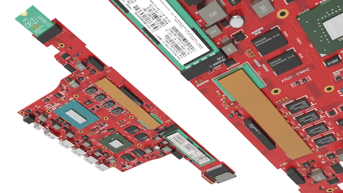 HP Omen 15 Laptop Motherboard is a three-dimensional model of component of modern, gaming, portable computer (laptop from Hewlett-Packard) that is a hardware element of a modern notebook.