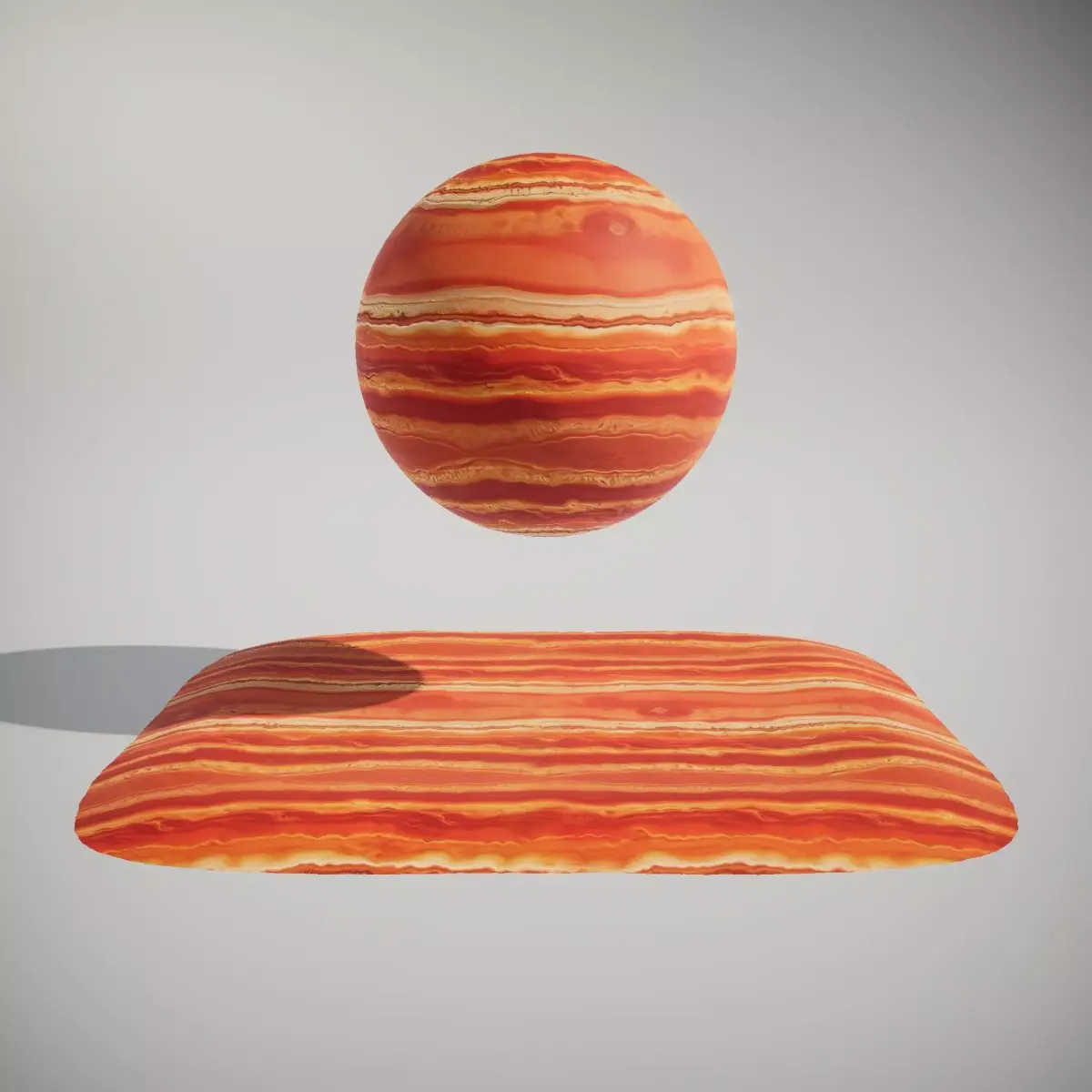 Seamless loop PBR Texture set 4096*4096 px, best for tiling any terrain, wall etc. This material features an abstract depiction of planetary gas bands, showcasing a warm color palette of deep reds and oranges. The surface is smooth with a subtle variation in texture simulating atmospheric patterns. Ideal for use in science fiction games, films, and architectural visualizations. The textures are seamless/tileable and PBR-ready, including maps: BaseColor/Albedo, Normal, Roughness, AmbientOcclusion, Height/Displacement. Available in 4096x4096 resolution and standard formats (PNG/JPG). Compatible with modern engines and DCCs like Unreal, Unity, Blender, 3ds Max, and Maya. Please like and comment if you find this useful.