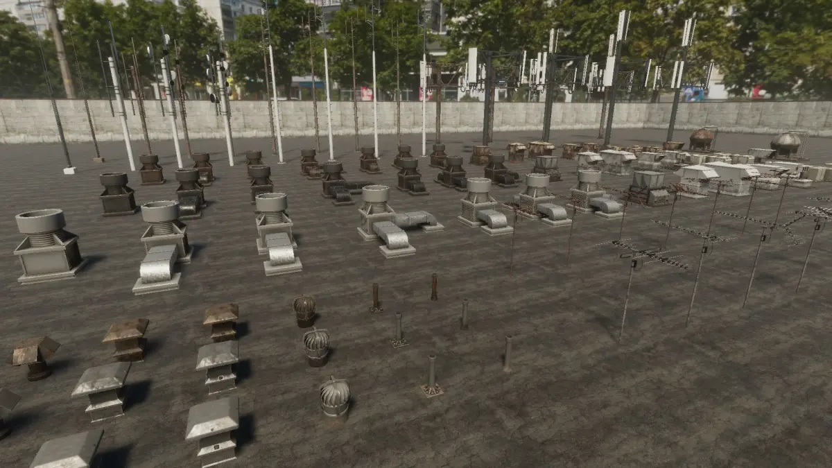-7 small antennas (each as clean and rusty version)-12 big antennas / radio antennas (each as clean and rusty version)-6 chimneys (each as clean, dirty and rusty version)-1 watertank (clean, dirty and rusty version)-15 vents / airconditions (each as clean, dirty and rusty version)