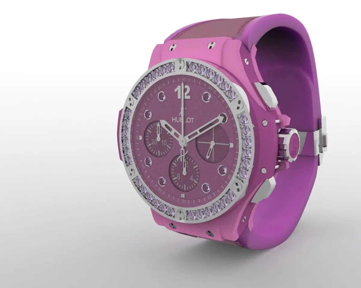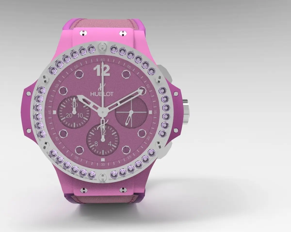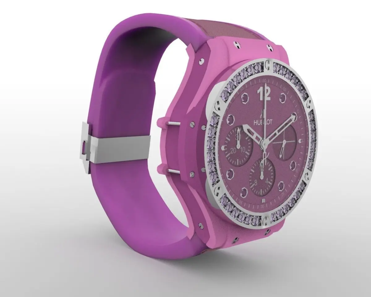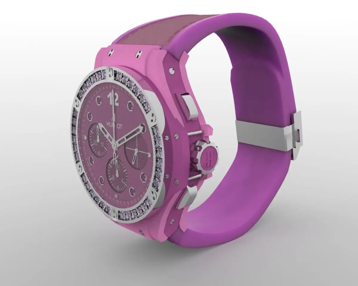 The 15mm thick automatic watch from the brand Hublot, with every detail of the dial, the plastic and leather bracelt and every button and screw
