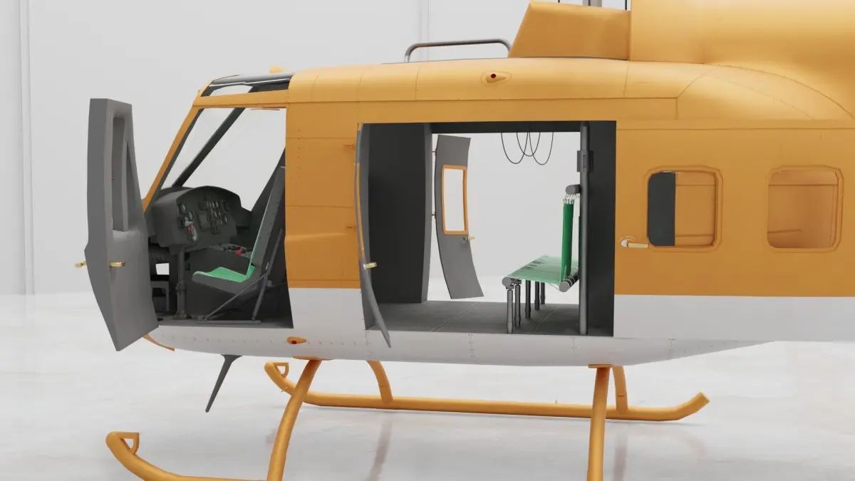 This is a Huey Helicopter, most known for its use in the Vietnam War. This is a civilian version, with uses ranging from hospital evacuations, search and rescue, and film or television recordings.