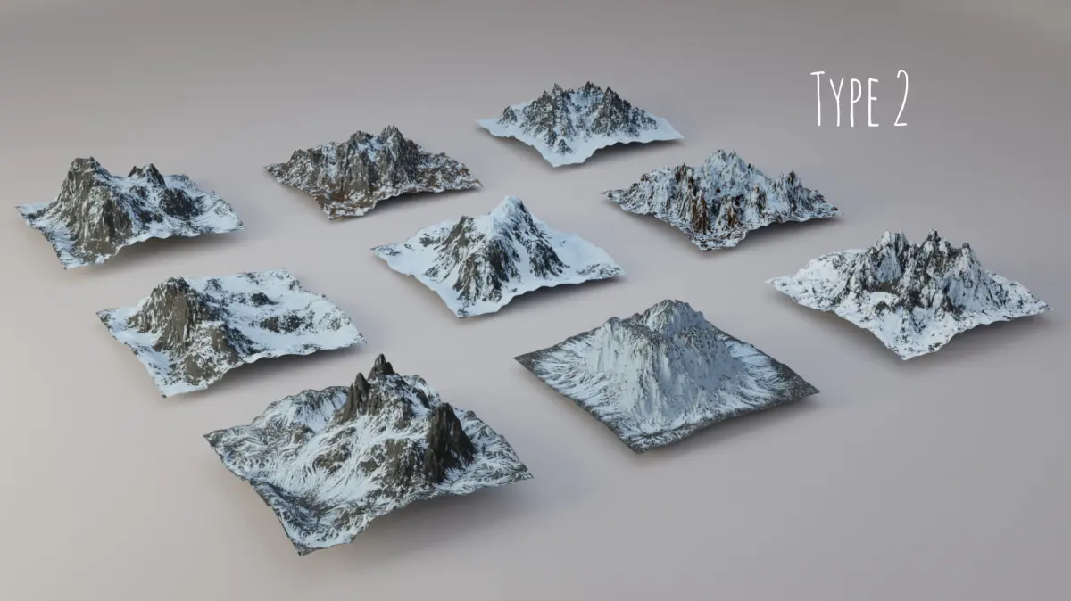 The terrains/mountains are basically ready for middle-distance renders and game projects, but don't worry, with the provided height maps and masks for each terrain, you can use them for close range renders or games and set your own subdivision level. Also everything in the blender file is ready to change.We offer one Terrain Material Generator in the package. All the terrain materials you see in the pictures above are created with a single generator. You can create different mountains such as desert, poles, alps, common mountains etc. just by changing the parameters. We have added very short tutorials as pdf and videos to make it easier for you.(We've also included the .sbs file for those who can use Substance Designer. This gives you 100% control.)