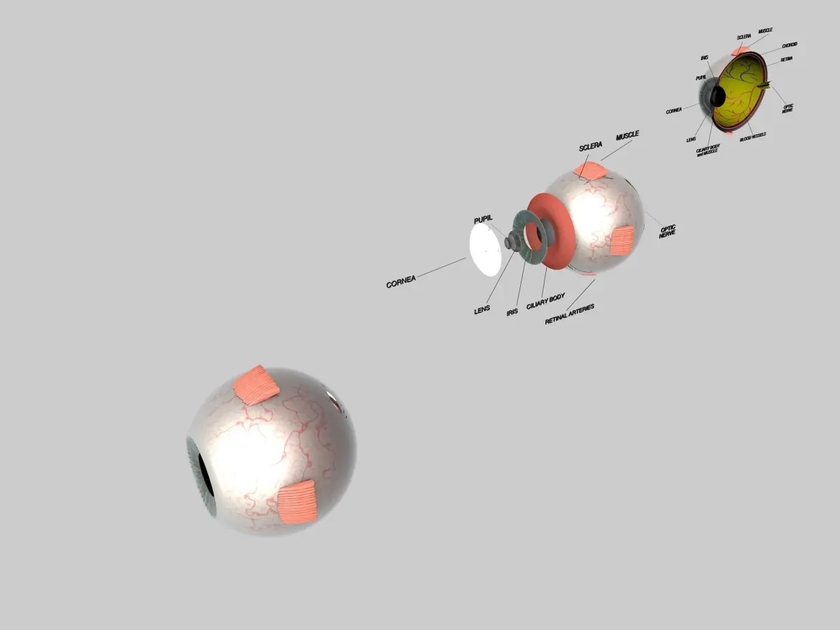 The Cross Section and Exploded view are both fully labeled with 3 dimensional (Editable) text, explaining the different parts of the human eye. (Everything included is exactly as pictured)