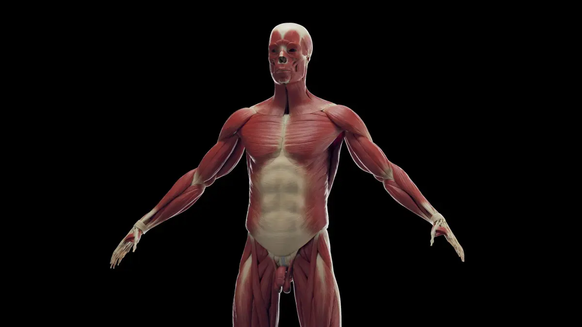 This is a high-end photorealistic 3D model of Human Male Skeleton and Muscles Static