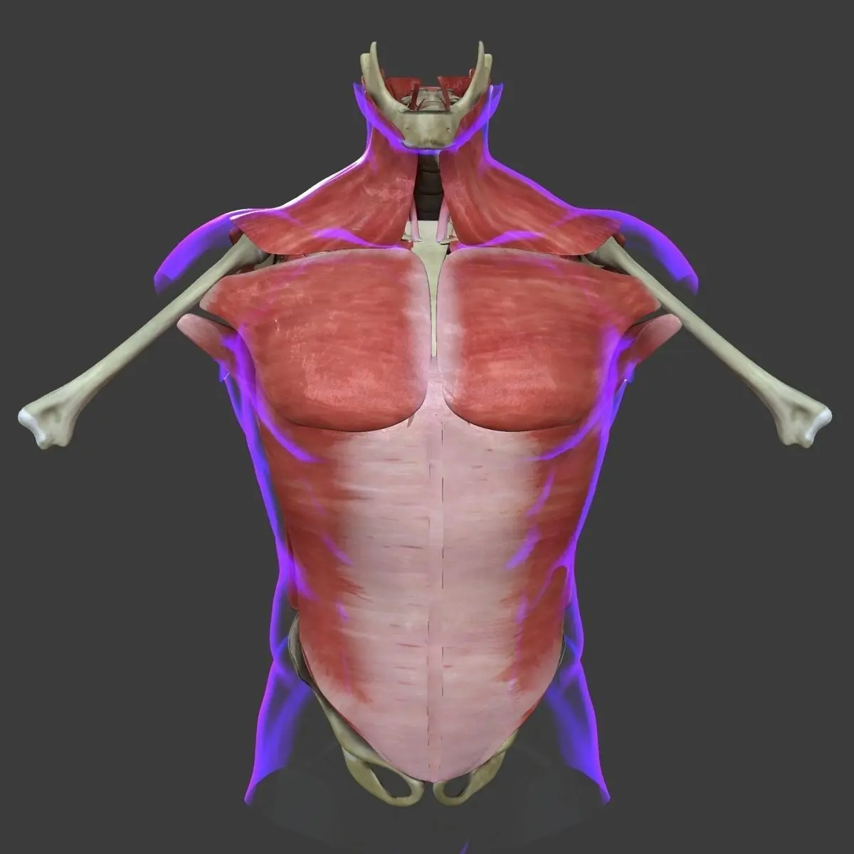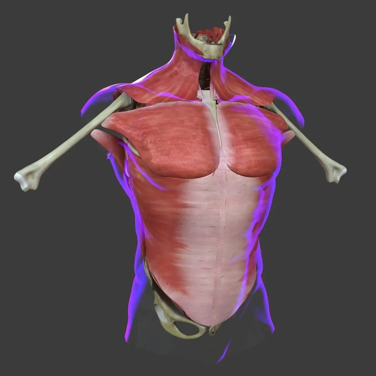 Each muscle of the torso is textured and has the correct origin and insertion points. Every effort was made to make sure this is anatomically correct as possible.