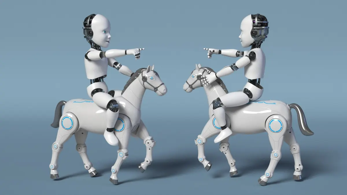 Humanoid Cyborg Child Riding Robotic Horse is a three-dimensional model of advanced robotic and cybernetic technology machinery that showcases the integration of human enhancement and artificial intelligence in a futuristic setting.