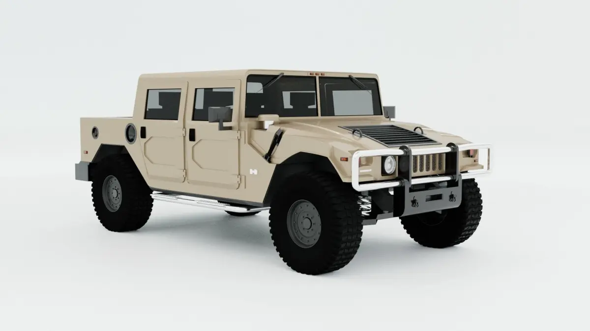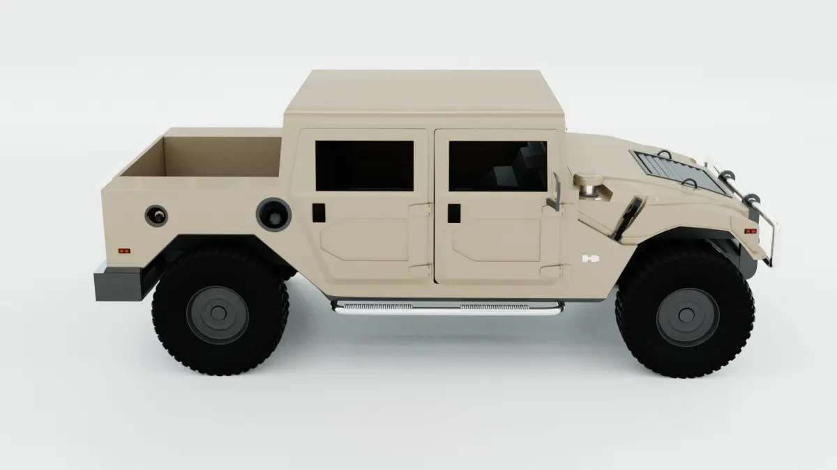 High quality 3D model of the exterior of HUMMER H1 body PICKUP. Made on renders from open sources.** Ready for subdivision for a smoother finish**. The geometry is not triangulated. Does not include interior. Included is a high quality tire model with high detail. The blender file has procedural materials. Each piece of geometry is grouped by material. The model is ready to render in Cycles.