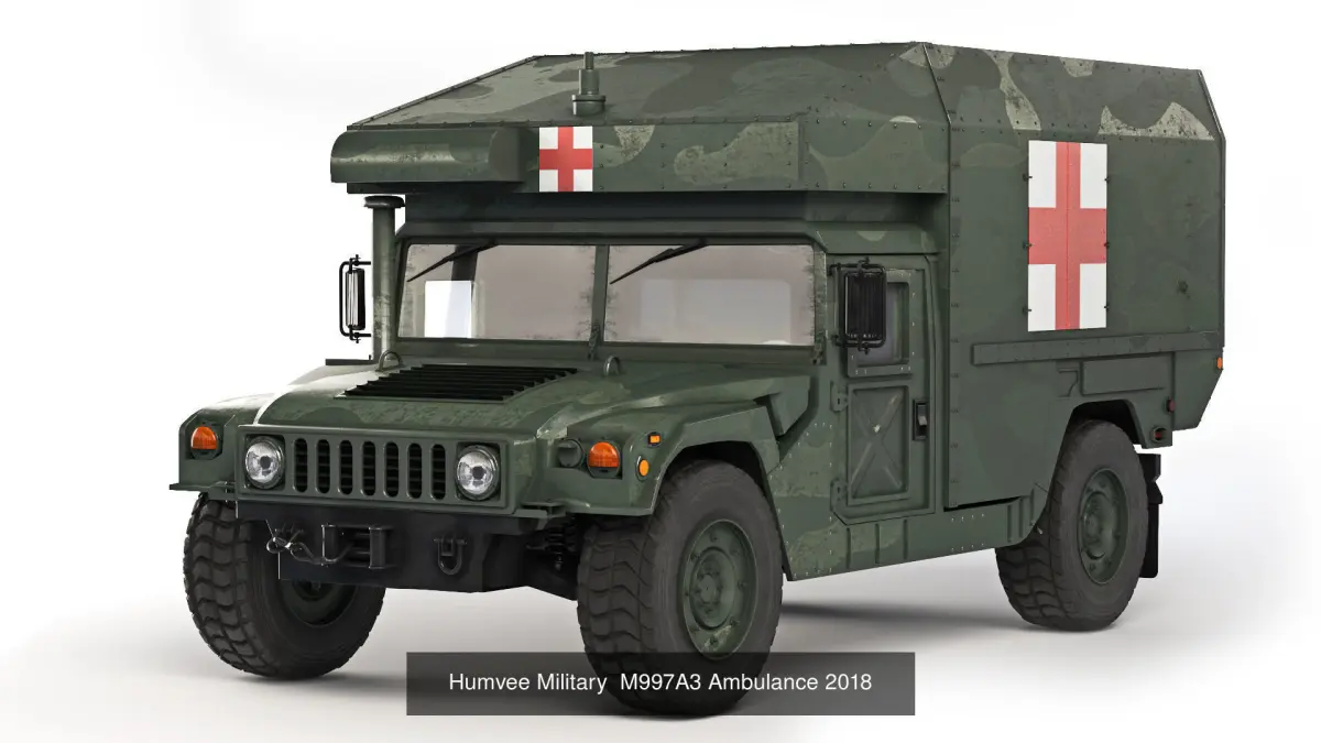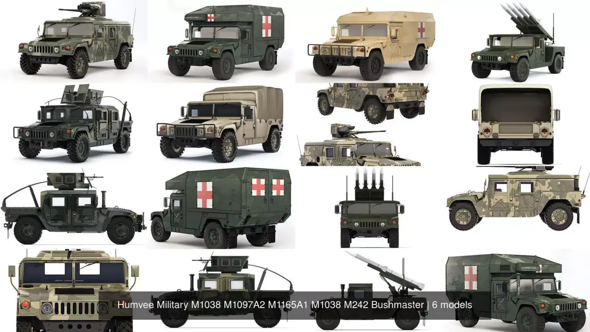 Collection of models of the military SUV Humvee. Six different versions and configurations. Infantry variant - M1165A1, Cargo transport - HMMWV M1038, Air defense - M1097A2 CLAWS AMRAAM, Medical basic - M996A1 Ambulance, Medical advanced - M997A3 Ambulance, Auxiliary combat crew - M242 Bushmaster.