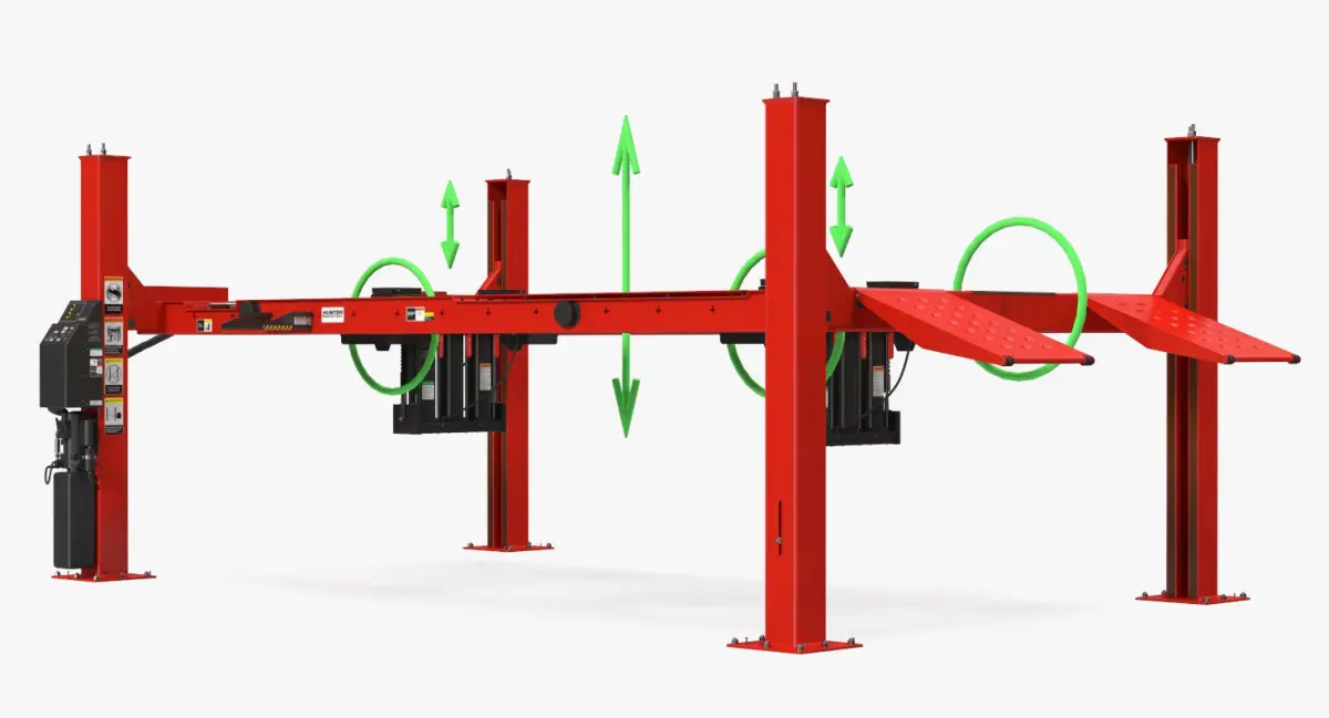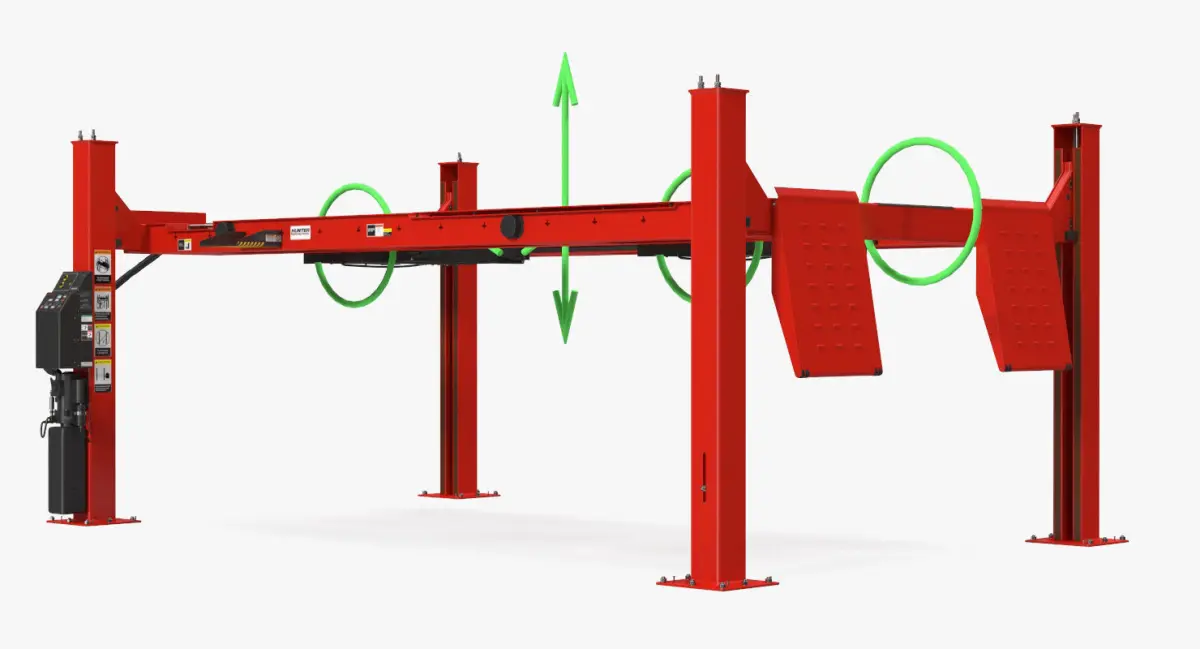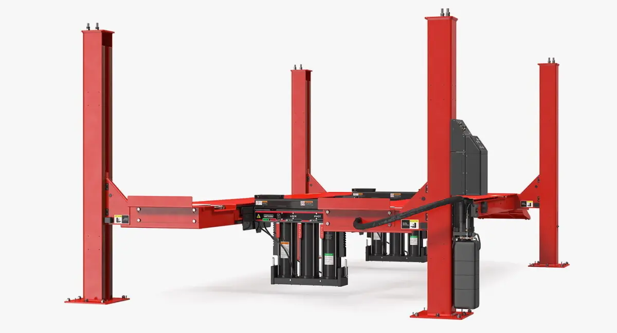 Hunter L451 4 Post Car Lift car service station maintenance equipment.Red four-post lift car repair tool with control buttons for pump operating, and raising the car lift. For car service centers, automotive industry, automotive engineering, car service, diesel and gasoline-powered automobiles, car service stations, car shops, and automotive engineering, advertising projects.