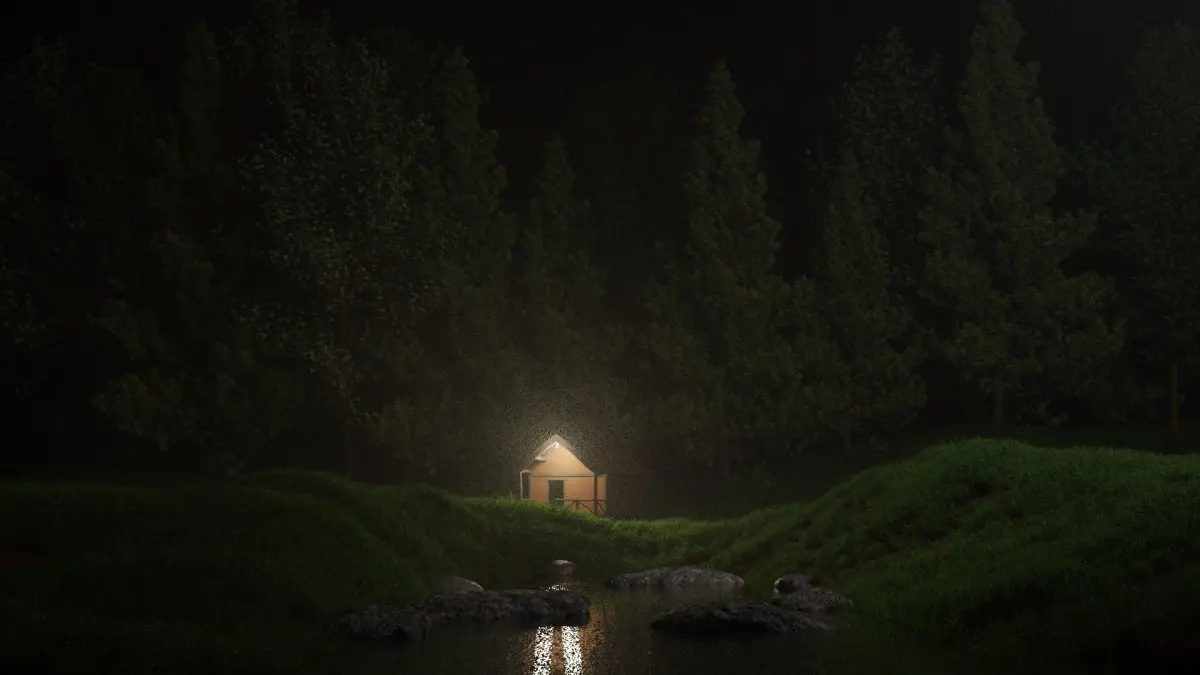 Realistic landscape of a hunters cabin in a grassy forest.FOR TREES and BUSHES use this link....http://www.blendswap.com/blends/view/78071