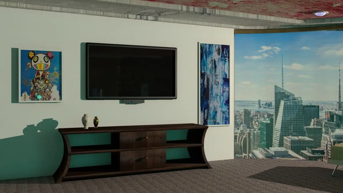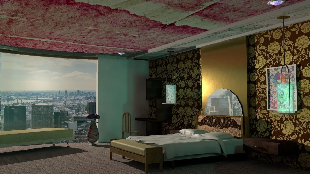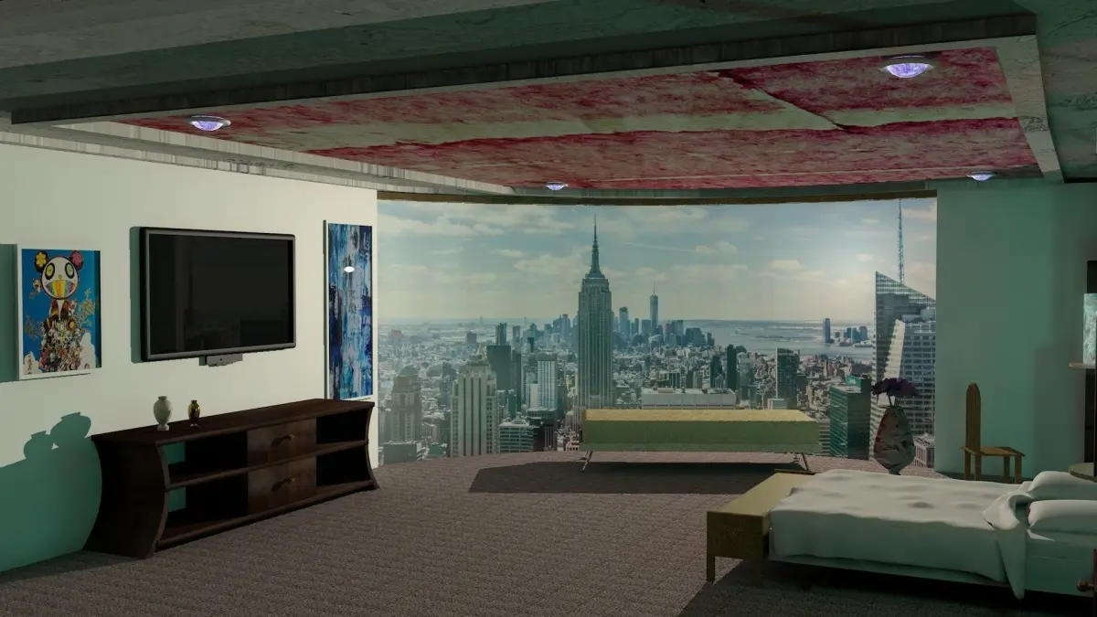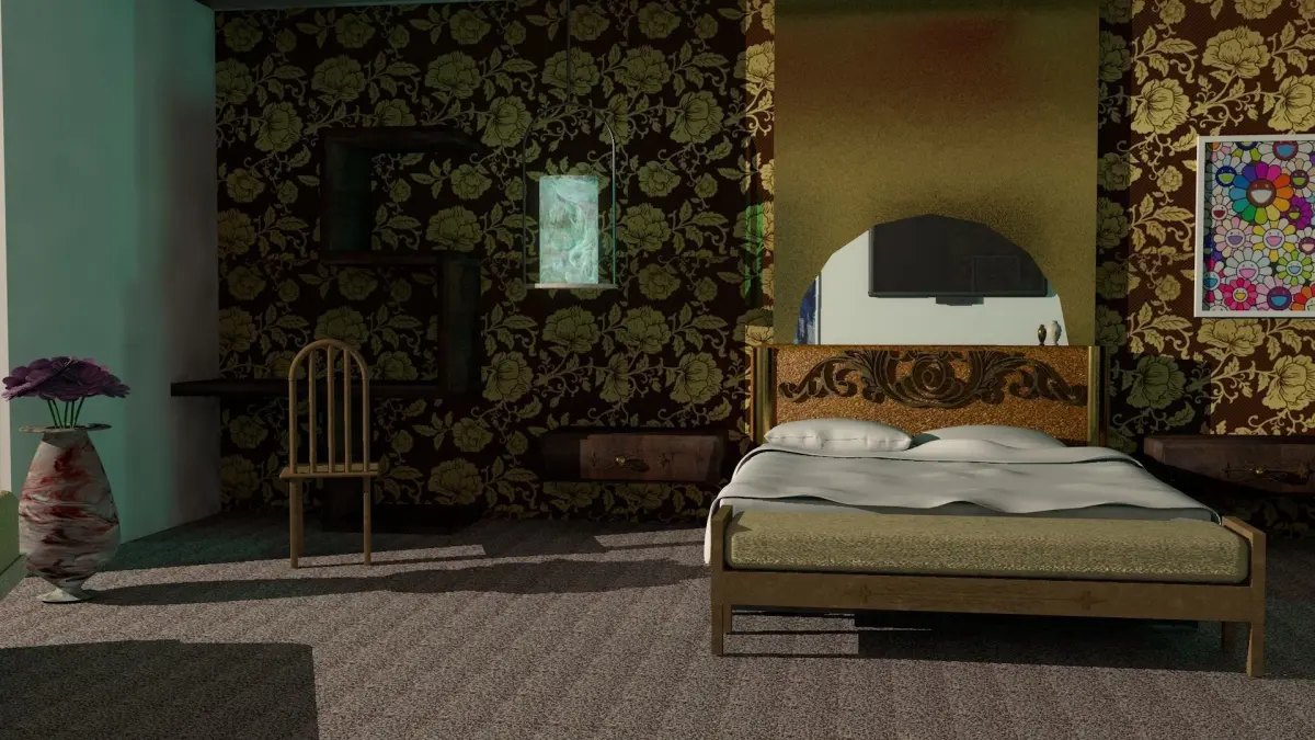 The HYATT HOTELS & RESORTS. The re-design includes thefollowing furnishings:King size bed with headboardPillowsNightside bed tablesBedside lightsClosetDresserCouch or ChairsReading tableRoom LightsPicture FramesWall Mounted TVThe room also has a scenic window.