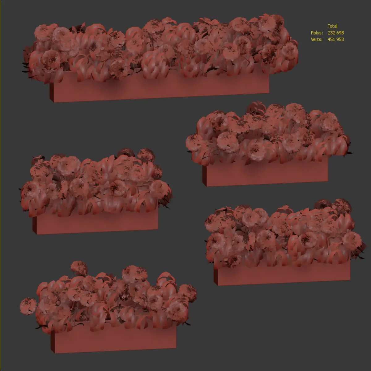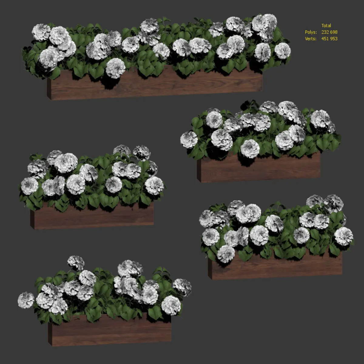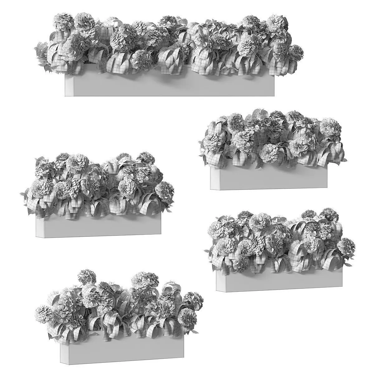 Set of five models of hydrangeas in boxes for landscaping the facade of a building or exterior