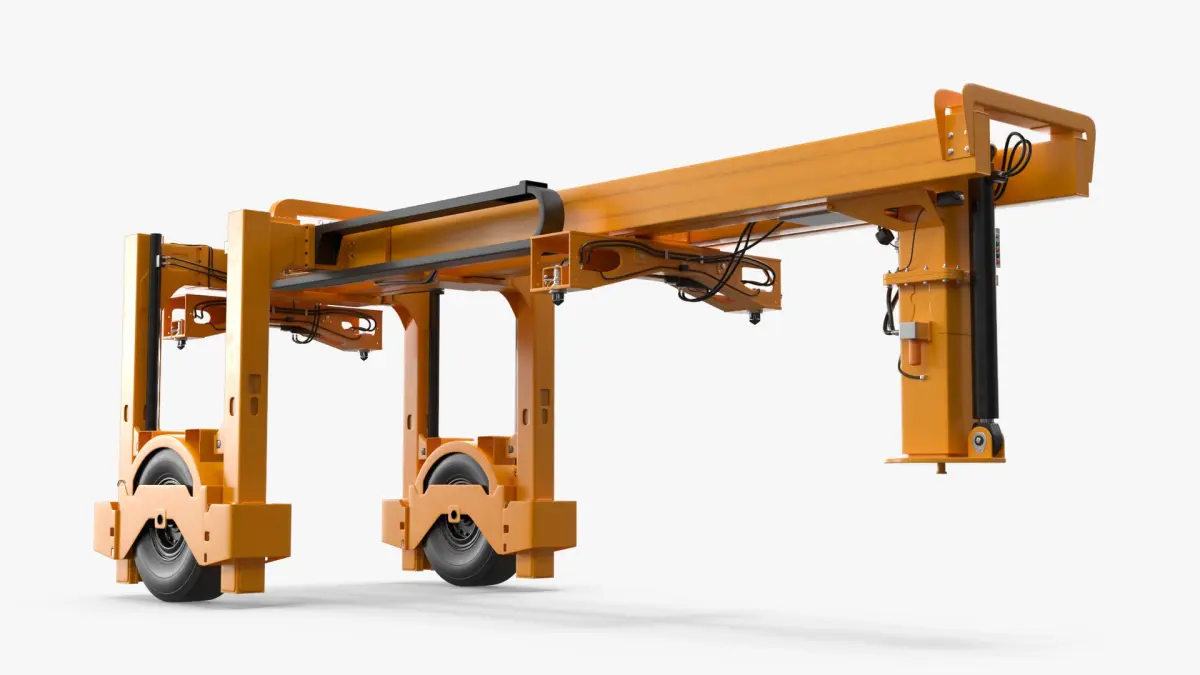 This equipment is designed to load, transport, and unload intermodal containers using a hydraulically operated lifting frame mounted on a semi-trailer or straddle frame. It is engineered for efficient handling of heavy cargo containers without the need for external cranes or loading docks. The model demonstrates hydraulic lifting systems, container securing mechanisms, and modular frame structures for stable and controlled operations.