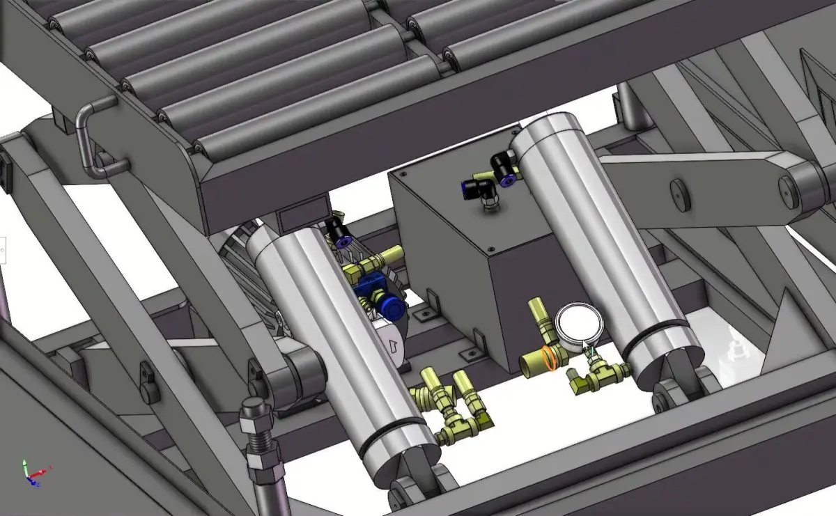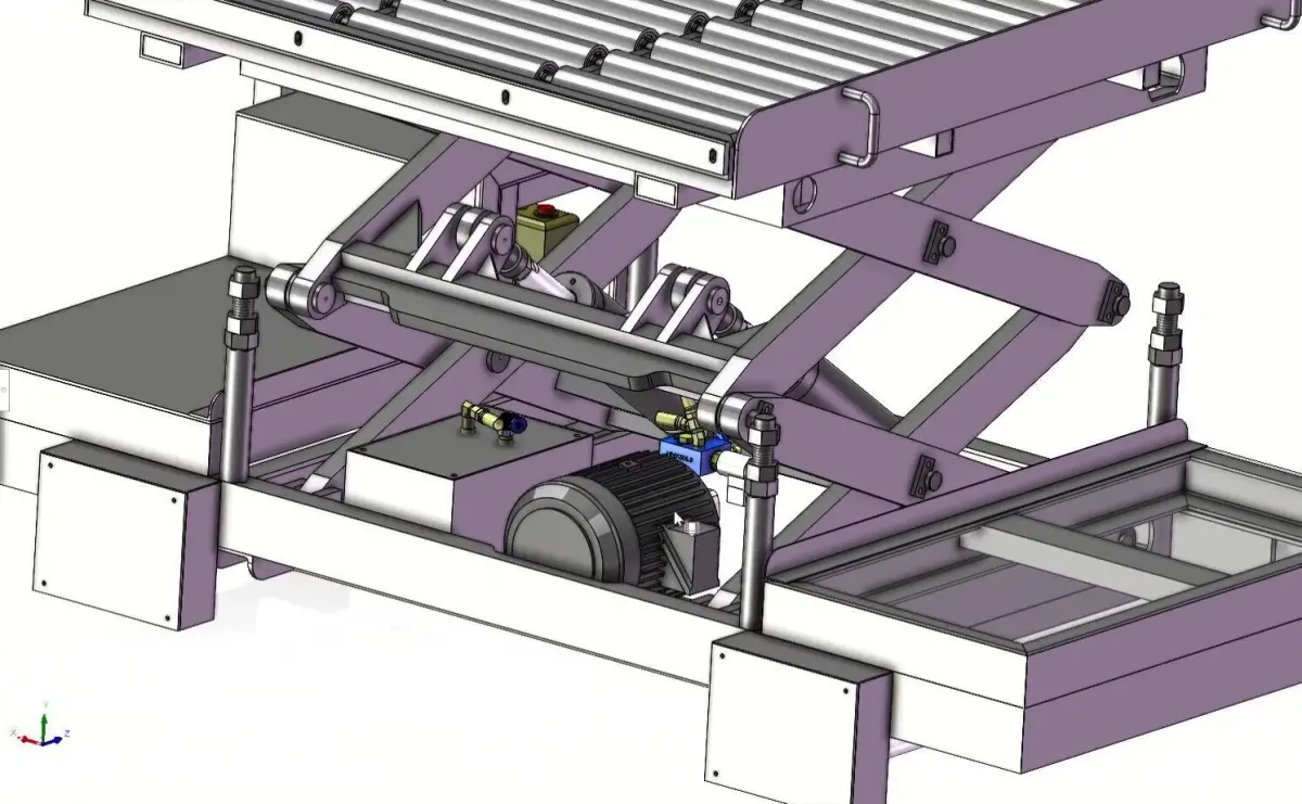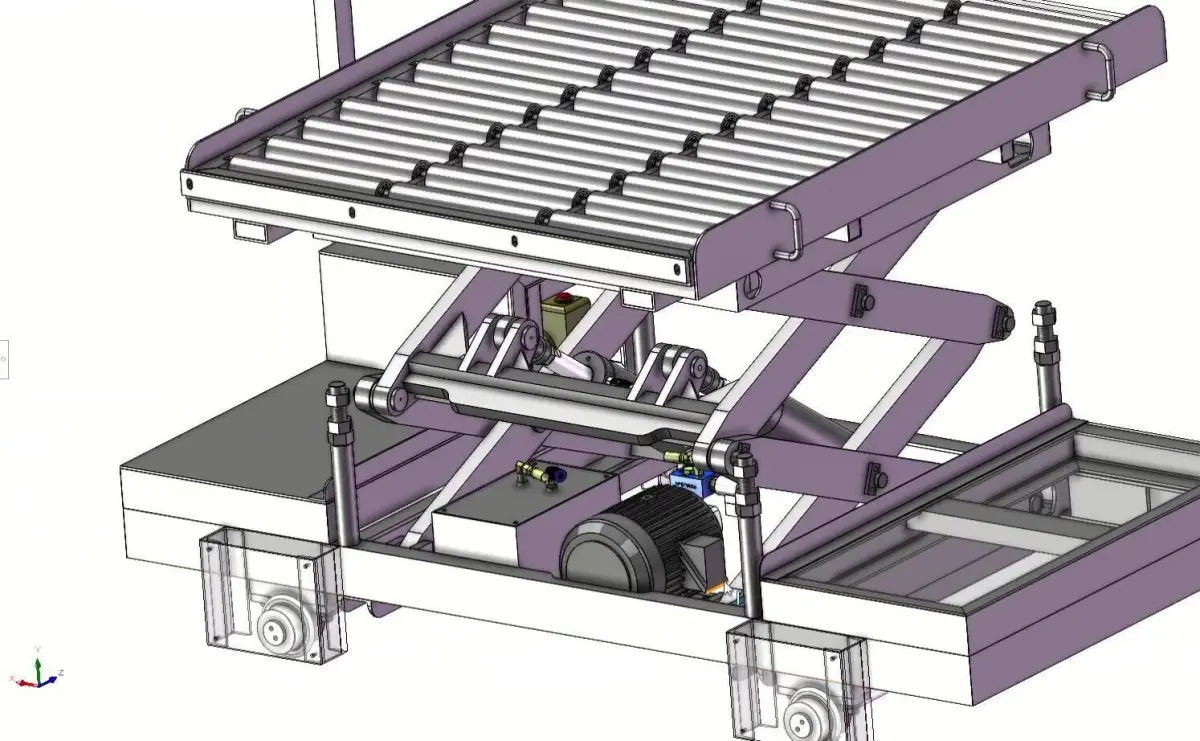 This 3D model showcases a hydraulic lift table integrated with a heavy-duty roller conveyor system. Designed for industrial automation and material handling, the structure features a scissor-lift mechanism for vertical adjustment and smooth roller operation for easy item transfer. Ideal for manufacturing lines, warehouses, and packaging systems, this design ensures efficiency, durability, and ergonomic functionality.