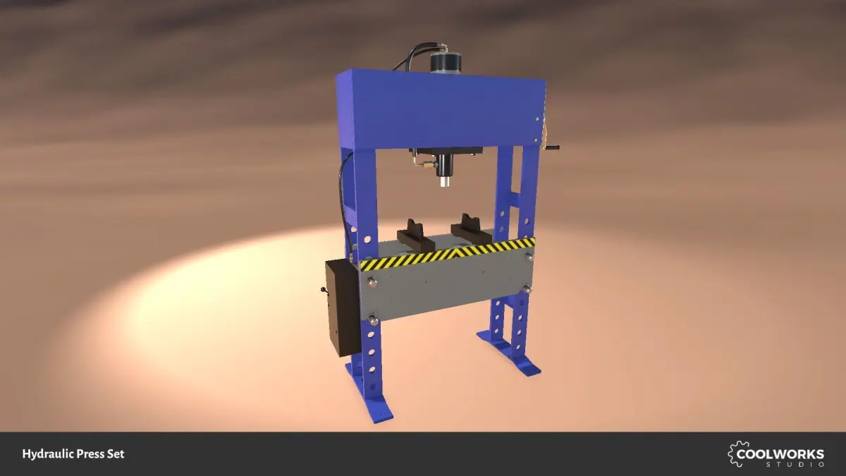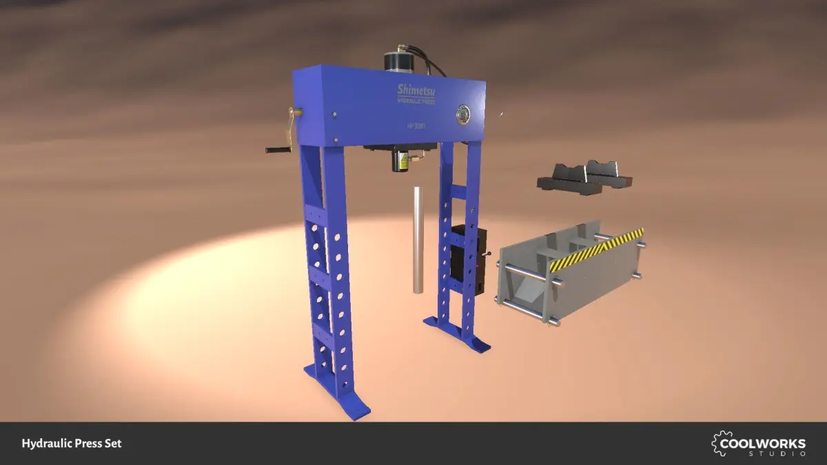 This package contains two hydraulic press meshes in FBX format, PBR (specular and metalness) materials and related high resolution textures (4096 x 4096 pixels) – Albedo – specular, Albedo – metalness, Ambient Oclussion, Smoothness, Specular, Metalness and Normal map.