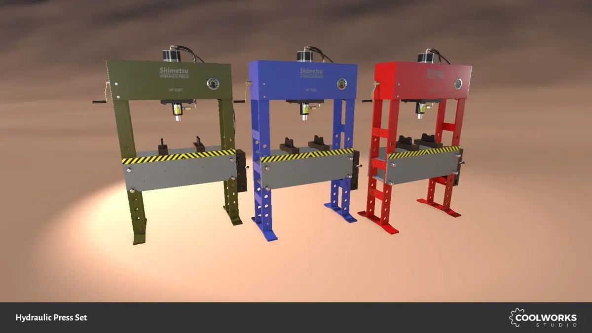 Set of two workshop hydraulic presses (animated assembly and static merged variant) in red, green, blue color – lowpoly PBR (specular and metalness) models. Animations (Unity package) of the assembly contain press shaft lowering and movement of the pressure gauge arrow, press blocks can be moved, exchanged or removed. This product contains Unity package (version 2021.3) with all prefabs in PBR metalness + specular and a separate archive with assets and Blender (EEVEE) file.