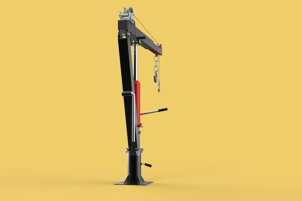 Workshop Crane: Designed for stationary use within a workshop or similar enclosed environment. Typically mounted to the floor or a sturdy base for stability.Hydraulic Lifting System: Utilizes hydraulic cylinders and a pump (often hand-operated or foot-operated) to provide powerful and controlled vertical lifting of loads. Hydraulic systems offer significant lifting capacity and smooth operation. Swivel/Slewing Boom: Features a jib arm that can rotate horizontally (slew) around a central pivot point. This allows the operator to lift and position loads within a wide arc without moving the entire crane base. The swivel mechanism can often be locked in place for stability.Manual Hand Crank Winch: Incorporates a hand-cranked winch mechanism for the precise horizontal movement or fine adjustment of the lifted load along the jib arm. This allows for accurate positioning of items before lowering.Hook Attachment: A sturdy hook at the end of the lifting cable or chain (connected to the hydraulic cylinder) for secure attachment to various loads using slings, chains, or other lifting hardware.Load Capacity: Designed with a specific lifting capacity determined by the hydraulic system's capabilities and the crane's structural strength.Adjustable Boom Length (in some models): Some workshop cranes may feature an extendable jib arm to provide variable reach depending on the task. Safety Features: Includes safety mechanisms such as overload valves in the hydraulic system, locking pins for the swivel mechanism, and potentially a brake on the winch to prevent uncontrolled lowering.Sturdy Base: Mounted on a stable base to ensure safety and prevent tipping during lifting operations. May include wheels or casters for limited mobility within the workshop.Benefits: