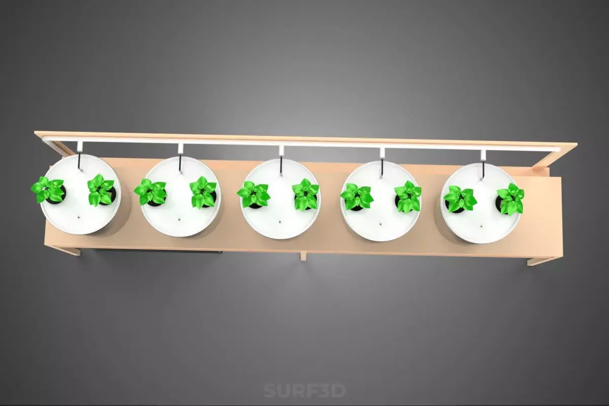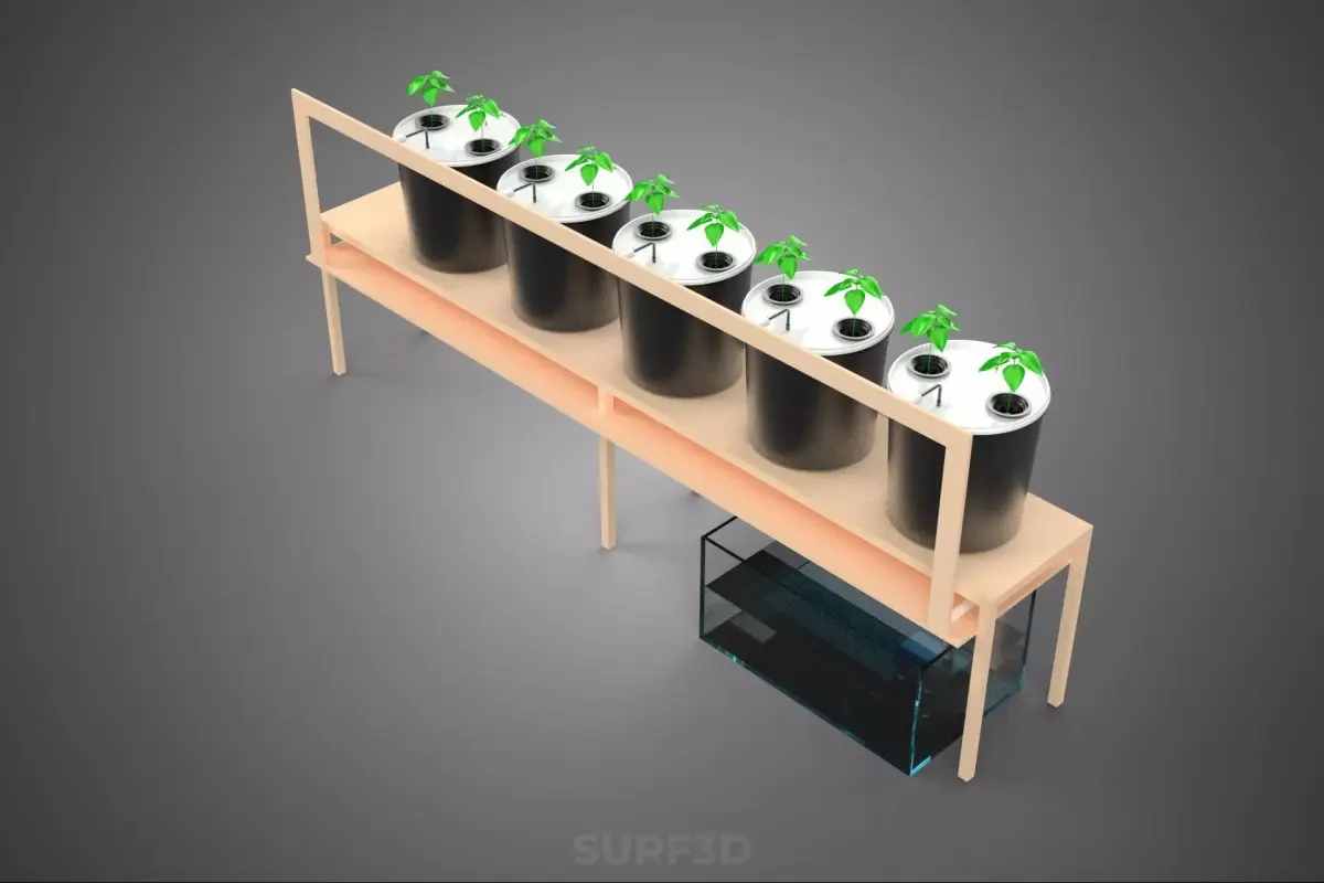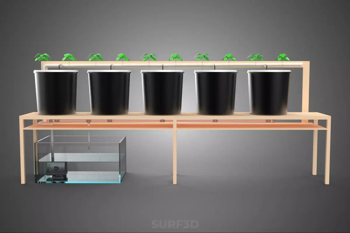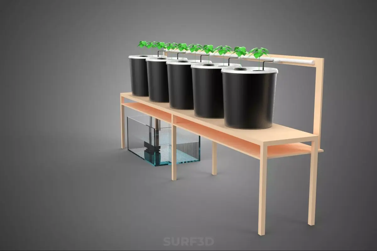 - Reservoir and Return Line: A central tank for nutrient mixing, monitoring, and storage, connected to the buckets by the gravity-assisted return line.