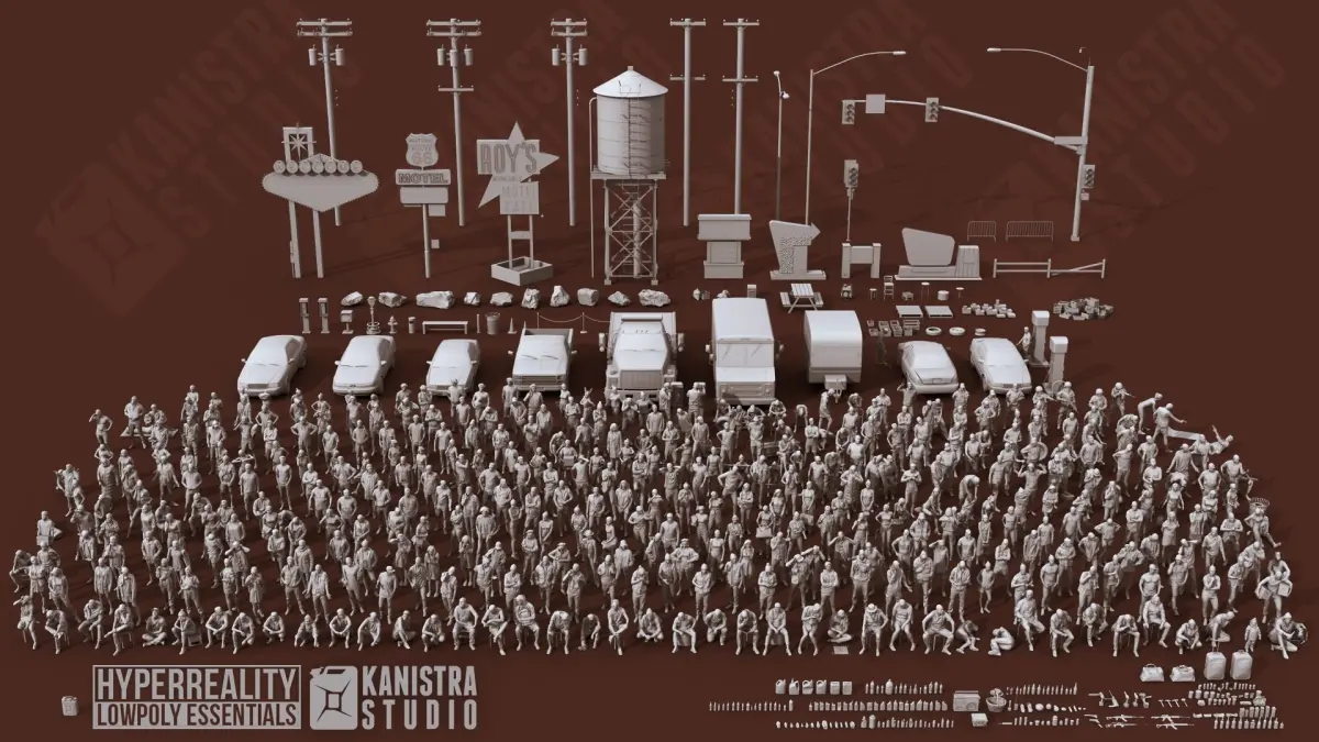 Hyperrealistic Lowpoly Essentials is a set of 3D stylized lowpoly characters models and entourage items and props, thoughtfully designed to infuse depth and realism into your creative projects.