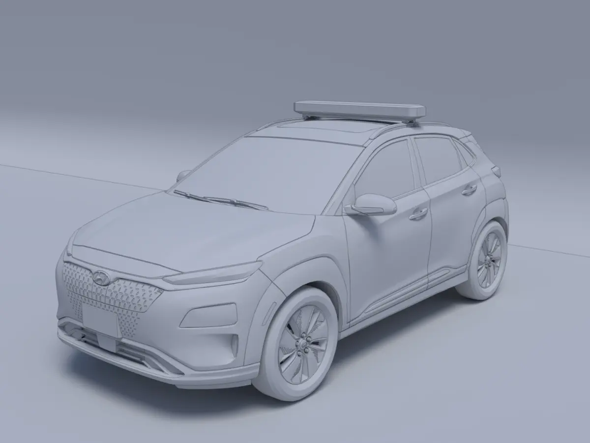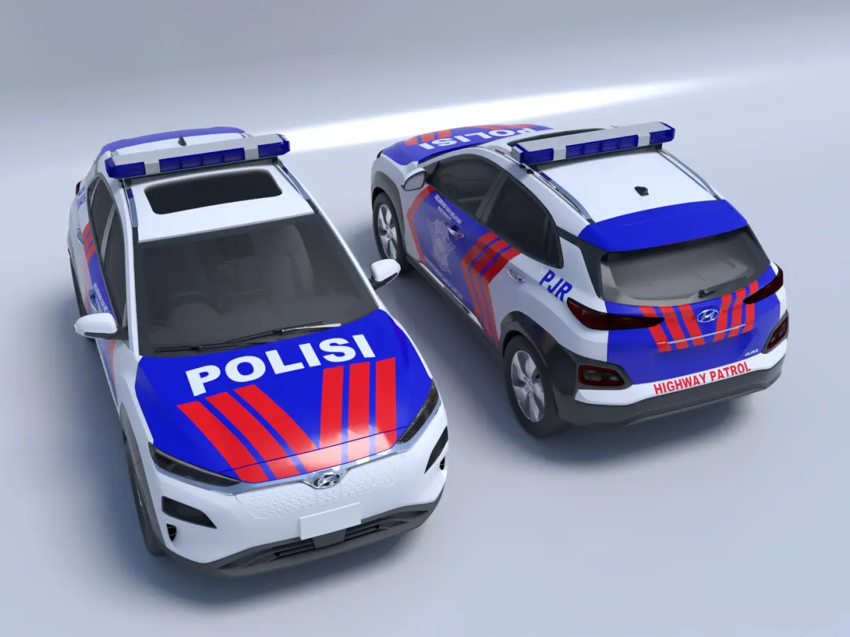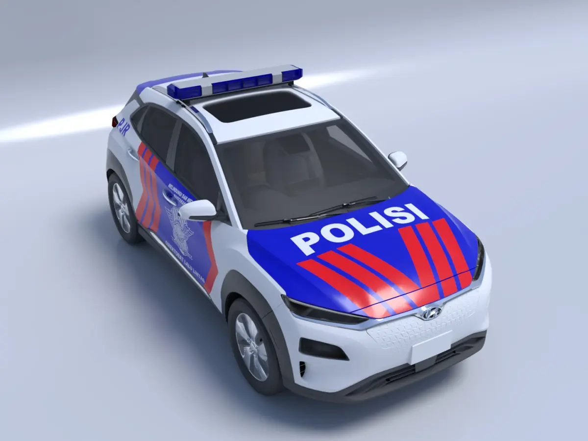 This is a high-quality 3D model of the Hyundai Kona EV 2022 – Indonesian Police (Polri) Edition, created in SketchUp. This model features a detailed exterior wrap inspired by the official livery of the Indonesian National Police traffic unit (Direktorat Lalu Lintas), complete with decals, police text, and emergency roof lights.