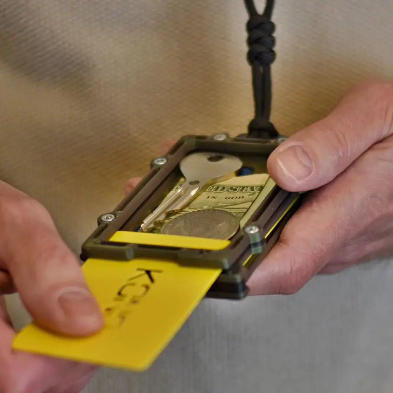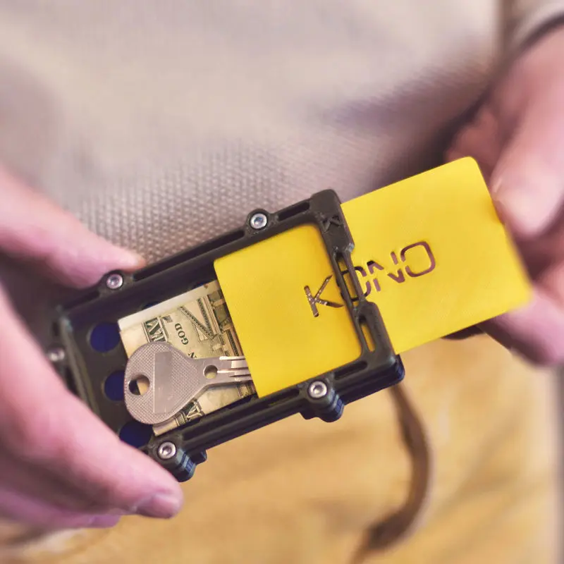 slim, very light and minimalist (just a bit bigger than a credit card) 3D printed wallet.spring retention system holds up to 6 cards.internal storage (under the top card) for 3 bills and/or keys and/or coinsand/or memory cards and other small items.