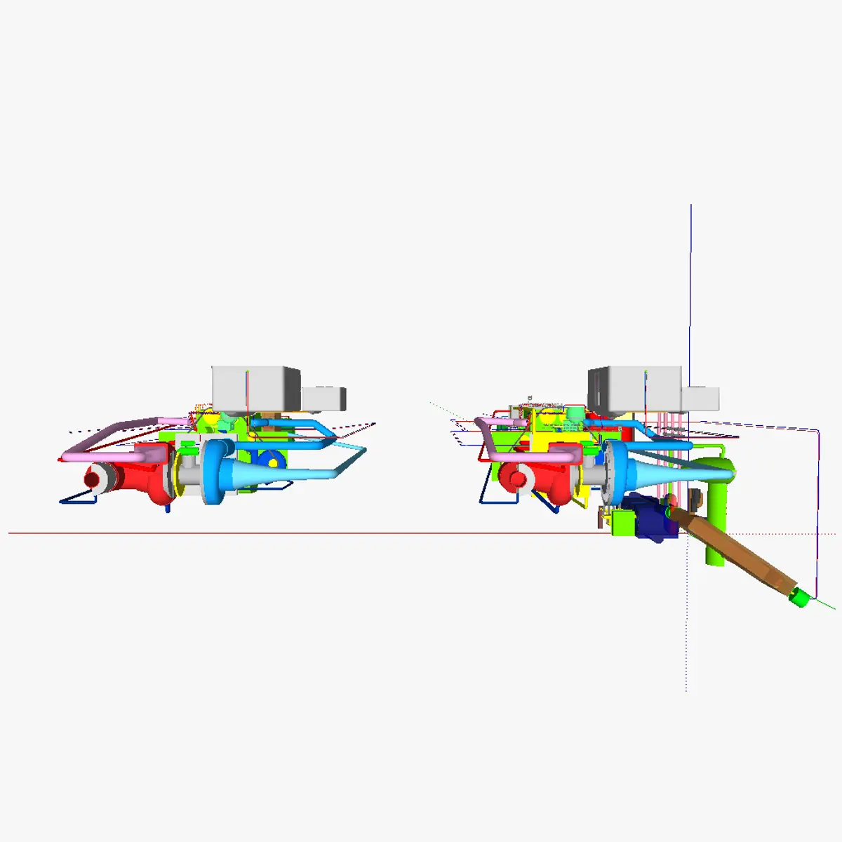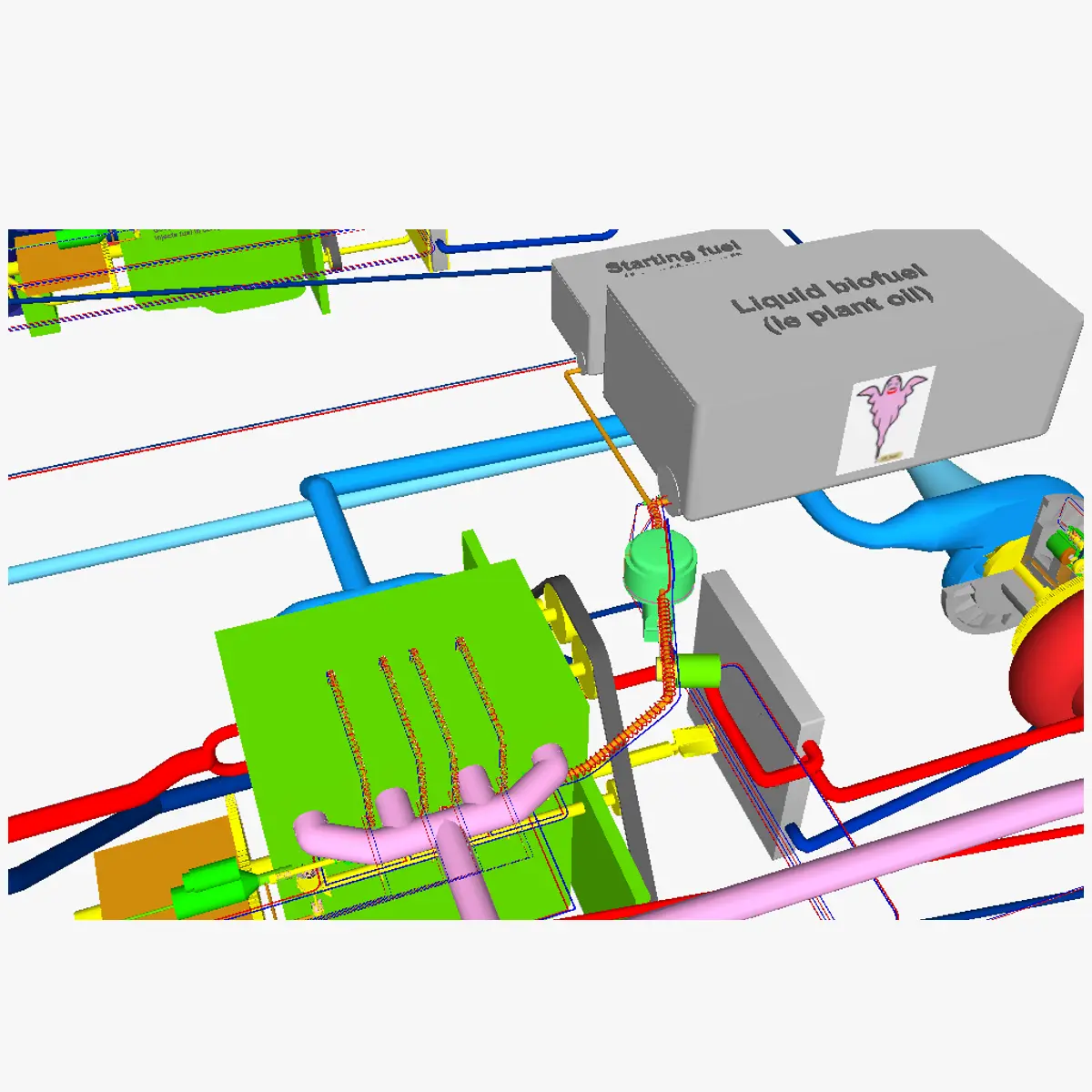 3D model of the AT IC motor 1 (Diesel version). This motor is designed specifically for running on 2nd generation biofuels. 2 setups are shown. One of the models is fitted only with an internal combustion motor, the other is fitted with a internal combustion engine and an (alpha-type) Stirling motor (the efficiency of the first is about 30%, the other has a 70% efficiency). The first setup is intented for mobile applications (use in vehicles) whereas the second is intented for stationary applications. Note though that although Diesel engines can thus be used for mobile applications, the engine is still relatively heavy, 2nd generation (non-2++) biofuels still create air pollution and a Diesel engine only runs most efficiently at a specific speed/load, so if a engine for mobile applications is wanted that has 70% efficiency, the IC 2 motor (with Stirling engine) is best used. Alternatively, the IC 2 motor in a hybrid_electric setup may also be a good idea. Both IC_1_Diesel setups run on ethanol for starting and stopping, and on vegetable oil for general running (the bi-fuel system is needed as the engine first needs to be sufficiently hot before the viscous vegetable oil can be used). For the same reason, the fuel line between the vegetable oil tank and the engine is heated using electrical heater wires. Although electrical wires are generally not used for this (instead most systems rely on the heated coolant water), with the combined IC-Stirling setup, it does not create energy losses as the waste heat of the IC engine is allready used for the Stirling motor anyhow, so tapping into this waste heat for fuel line heating would create equally large losses, making the use of electrical wire heating equally efficient. Where the wire does not need to be heated; the diameter is enlarged, causing much less heat to be released.