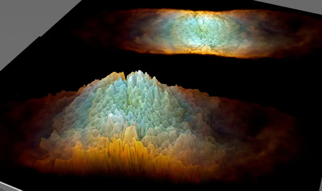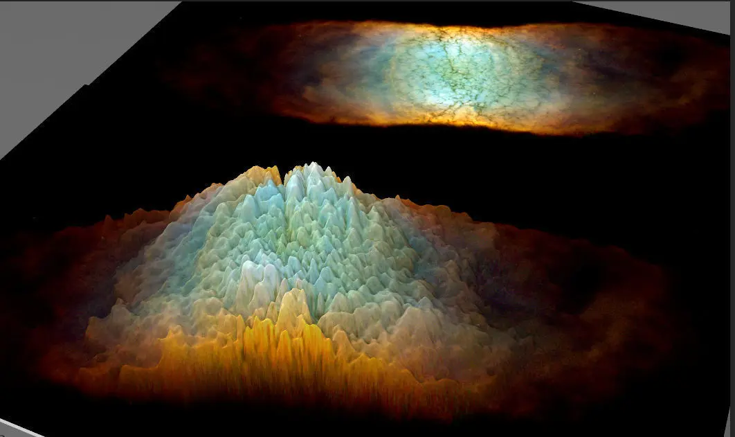 3D image obtained as a result of soft analysis of the 2D images of the new Hubble Space Telescope. The technique based on color analysis highlights the light of stars and ionized gases from the darkness of space, as gravity curves space, thus creating a spatially interpretable high-resolution 3-dimensional work.