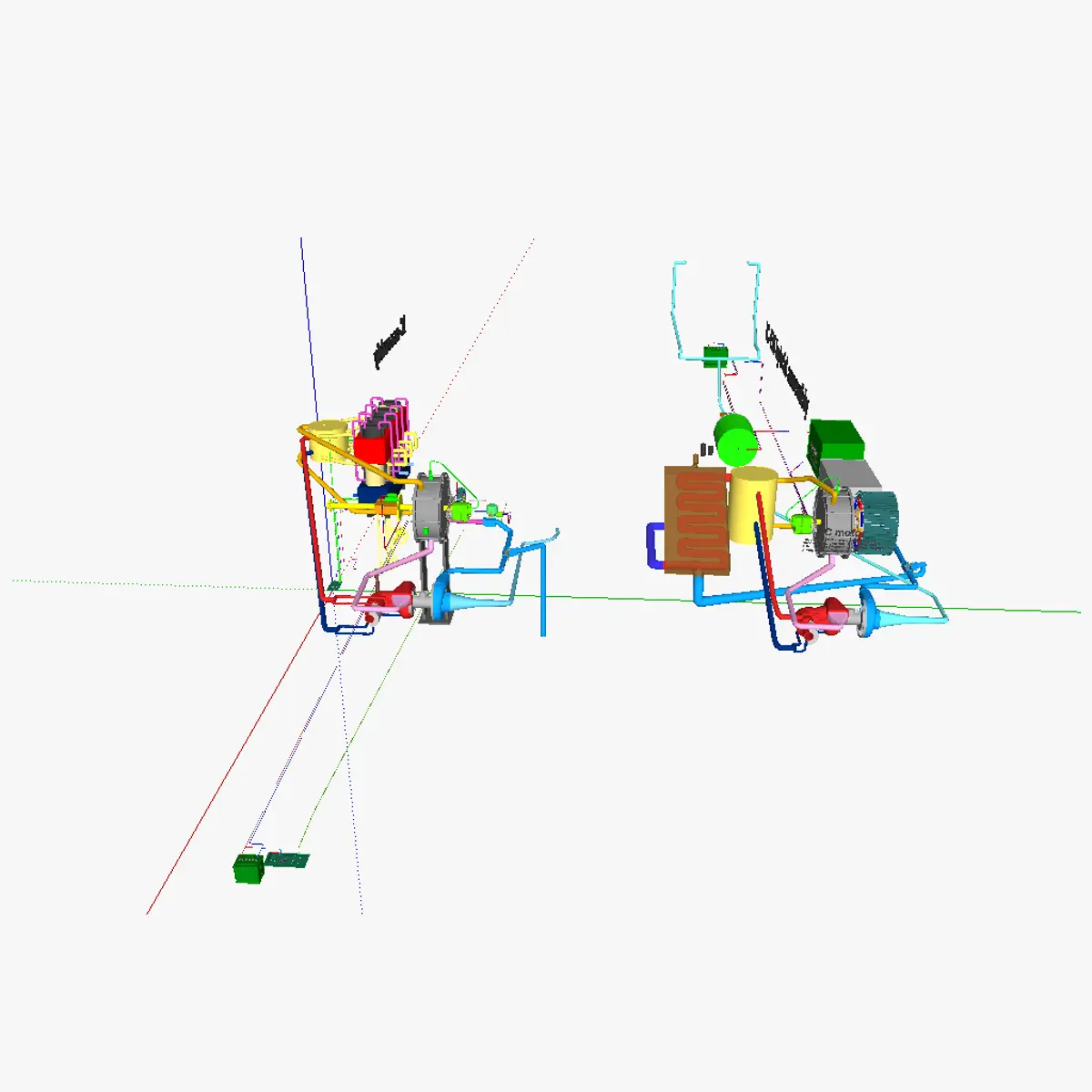 3D model of the AT internal combustion motor 2. 2 setups are shown. In both cases, the IC motor used is a quasiturbine. An oil jacket is used instead of cooling fins to discard heat. The heated oil is routed to a Beta-Stirling engine which converts the thermal energy to mechanical energy, improving the efficiency of the engine by 40%.