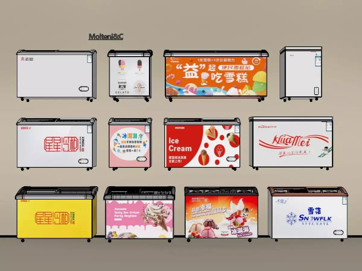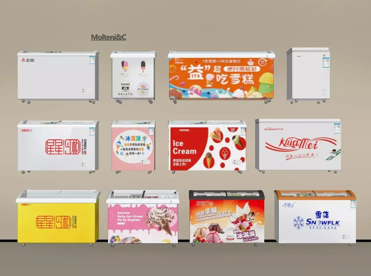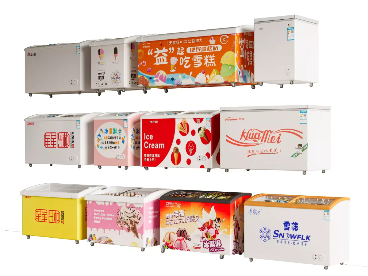 This is a very detailed 3D model of an ice cream freezer with curved glass doors. You can use it to create projects and learn how to render.