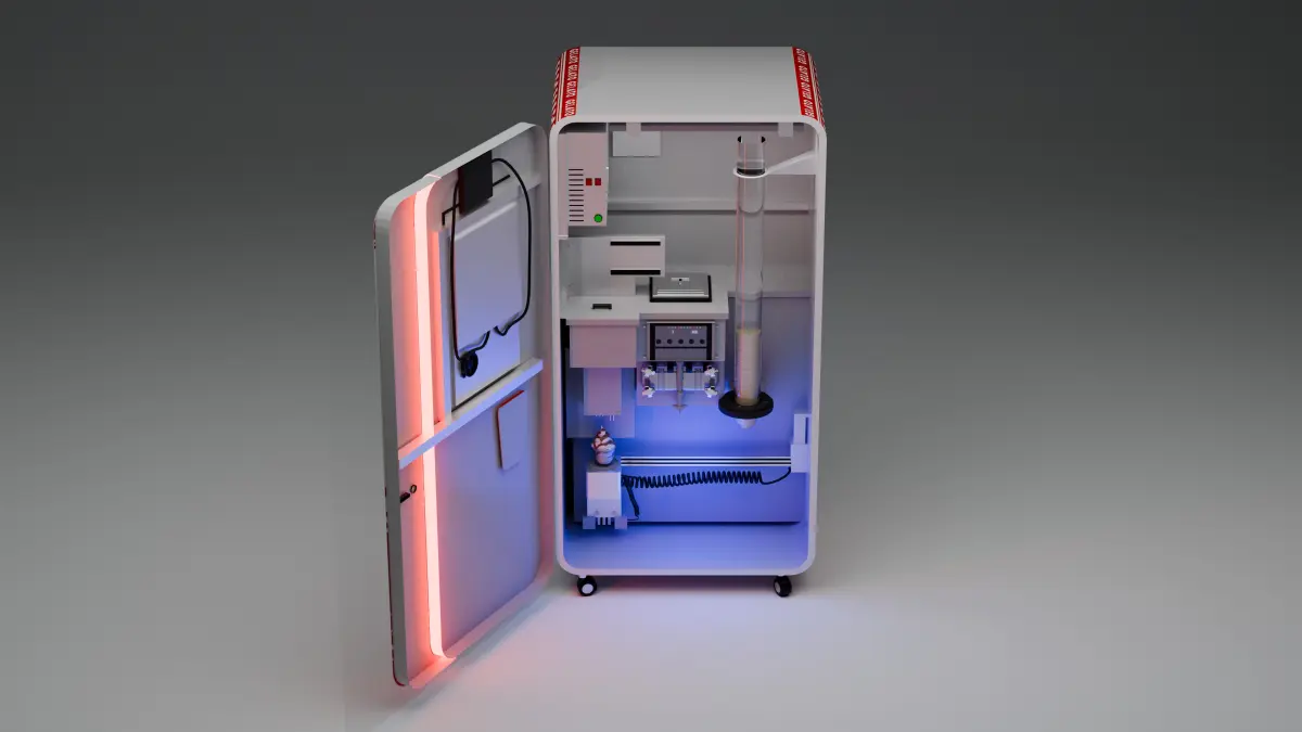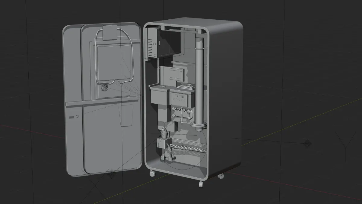 This 3D model showcases a modern automatic ice cream machine designed for both commercial and home use. The machine features a sleek, futuristic aesthetic with visible internal components, showcasing the intricate mechanics involved in the ice cream-making process. Its detailed interior includes a control panel, cooling system, and a dispensing unit, all housed within a compact and stylish frame. The model is highly detailed, with added textures to emphasize the realism of the machinery. This 3D model is perfect for visualizing ice cream machine designs, product presentations, or integrating into an interactive application.